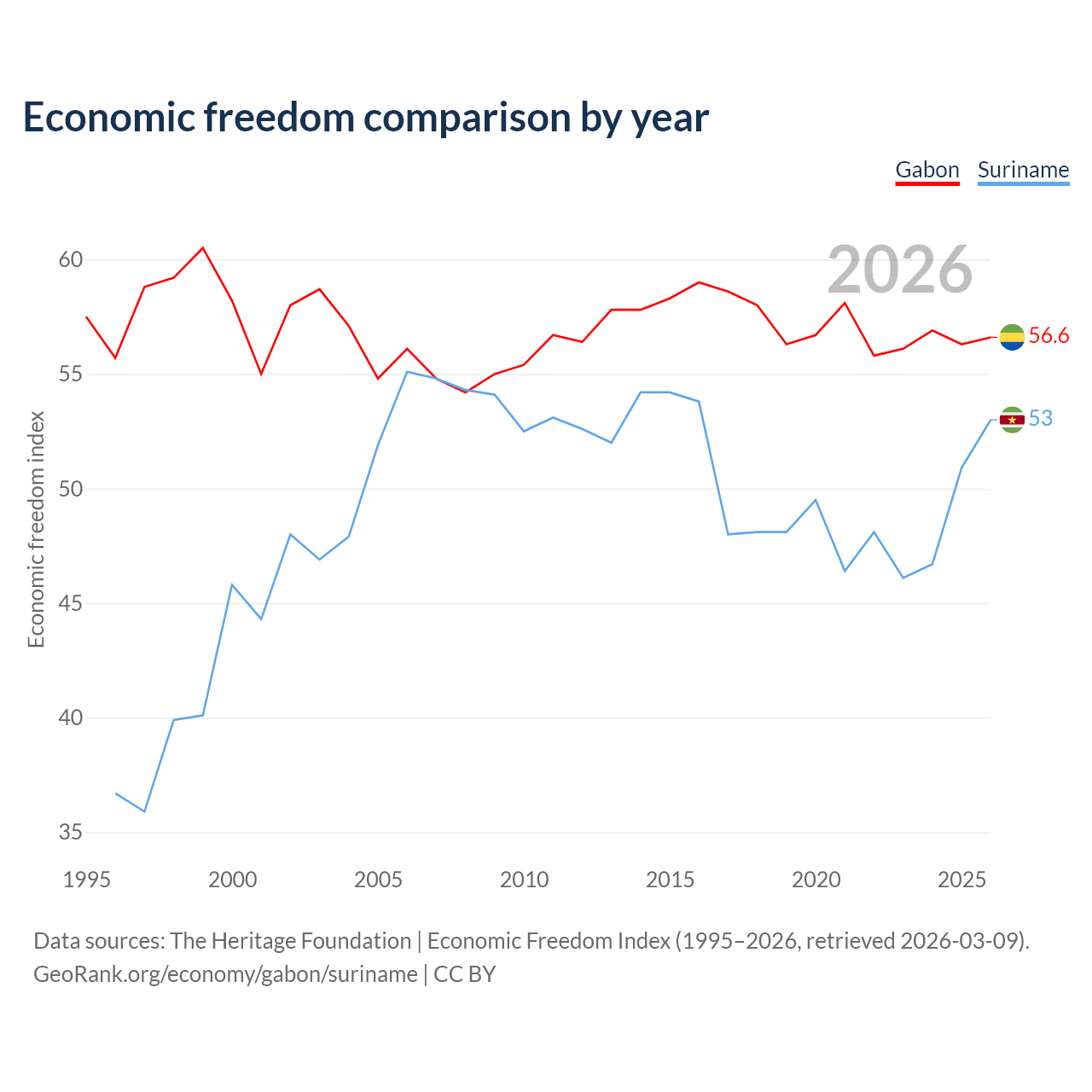 The Economic Freedom Index for Gabon is 56.6, ranking 120/197, compared to 53 for Suriname, ranking 143/197. The chart above displays a comparison of annual changes in economic freedom indexes.