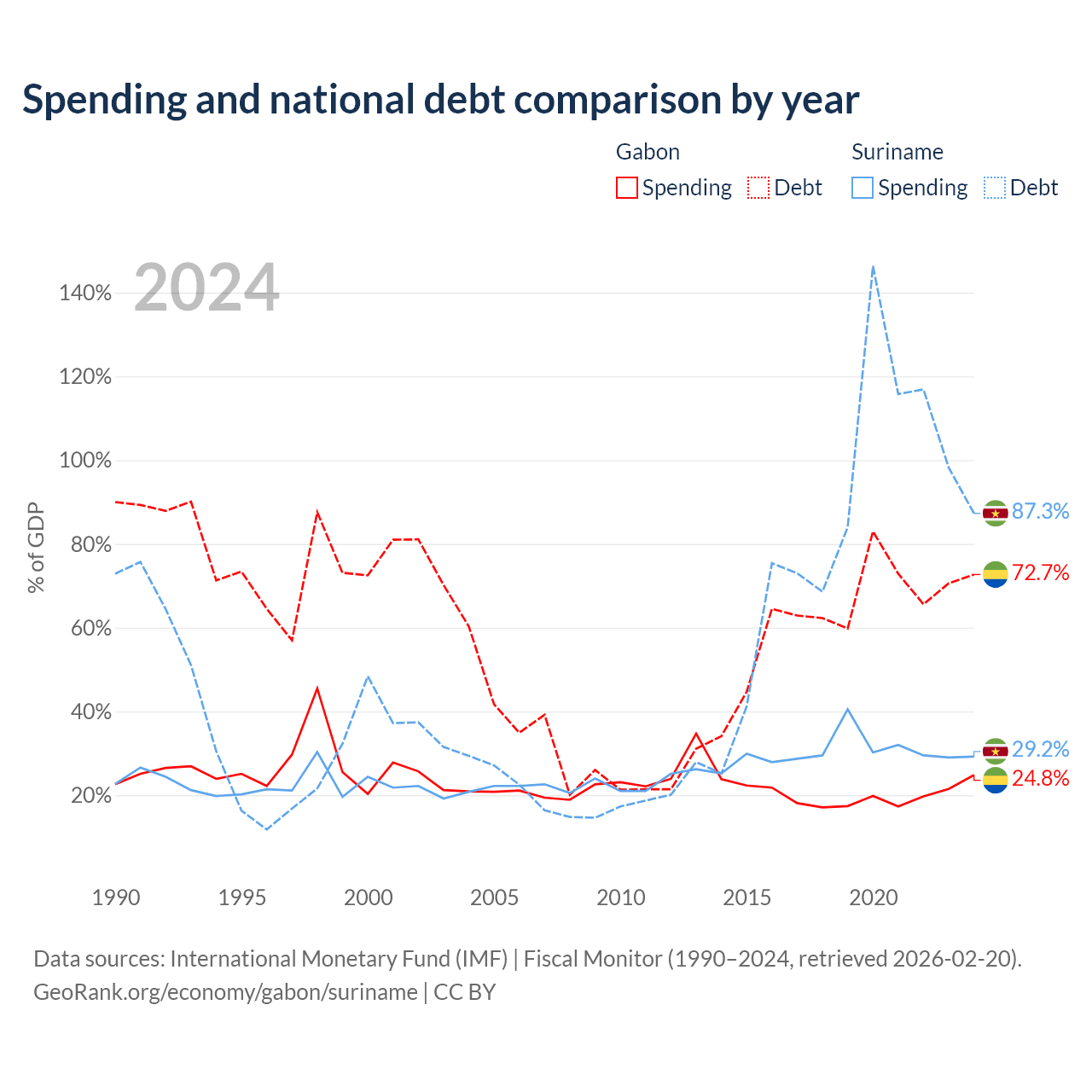Gabon has $15.2B in government debt (72.7% of GDP), compared to $3.86B (87.3% of GDP) in Suriname.