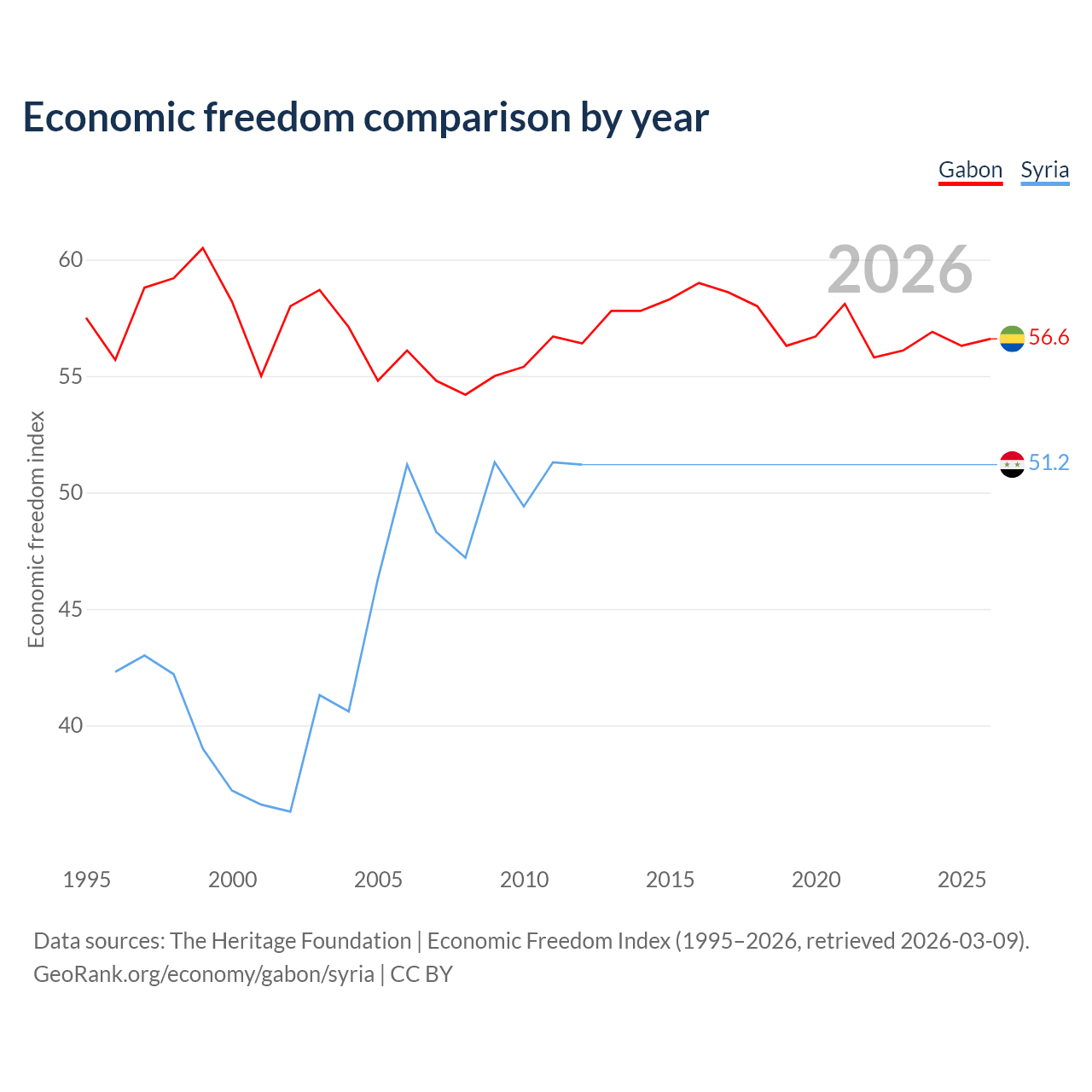 The Economic Freedom Index for Gabon is 56.6, ranking 120/197, compared to 51.2 for Syria, ranking 155/197. The chart above displays a comparison of annual changes in economic freedom indexes.
