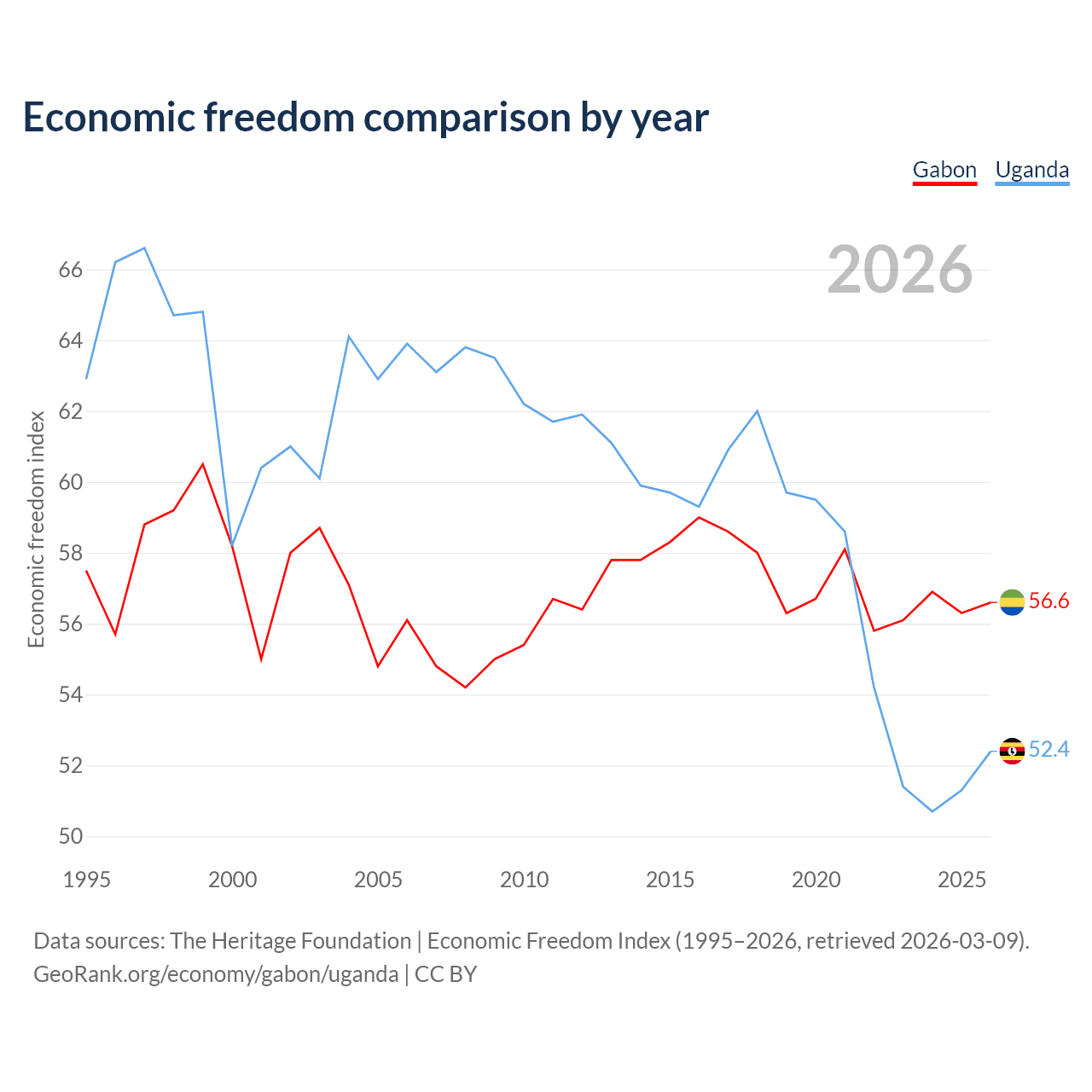 The Economic Freedom Index for Gabon is 56.6, ranking 120/197, compared to 52.4 for Uganda, ranking 149/197. The chart above displays a comparison of annual changes in economic freedom indexes.