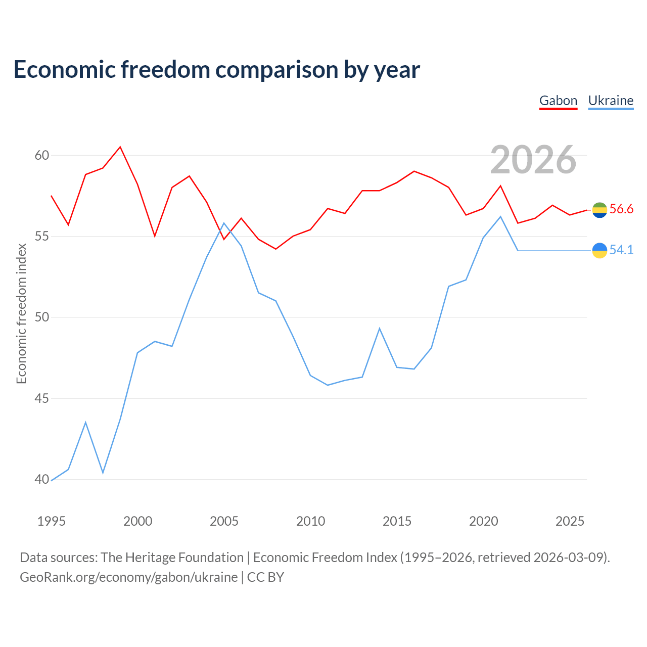 The Economic Freedom Index for Gabon is 56.6, ranking 120/197, compared to 54.1 for Ukraine, ranking 135/197. The chart above displays a comparison of annual changes in economic freedom indexes.