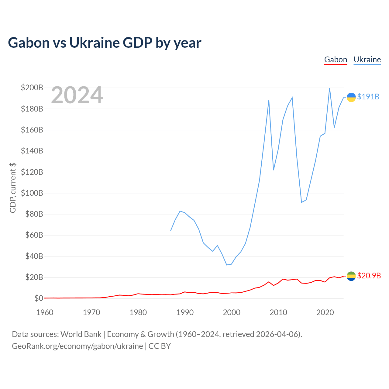 Gabon has a GDP of $20.9B compared to $191B for Ukraine, ranking 127/197 and 57/197 by economy size, respectively.