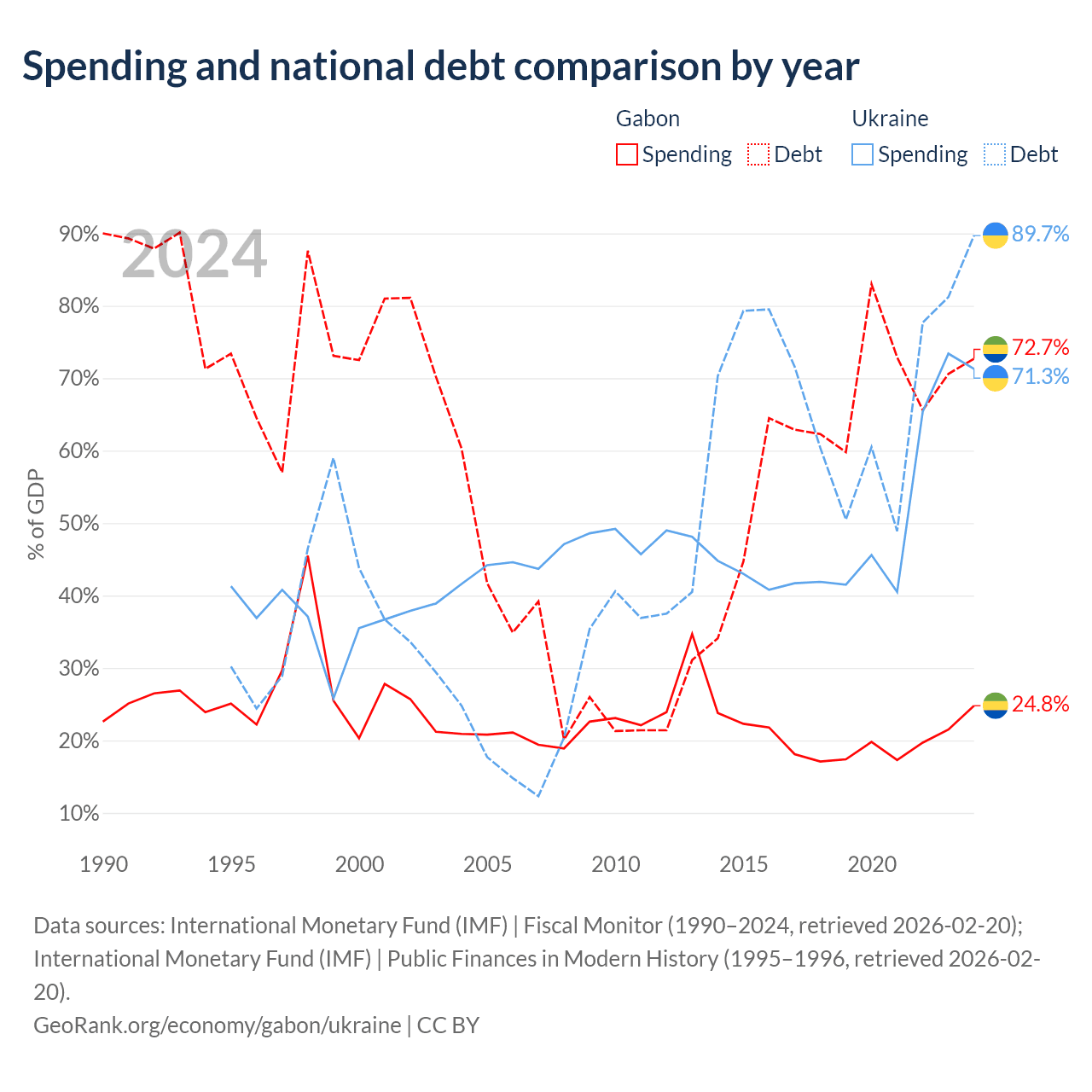 Gabon has $15.2B in government debt (72.7% of GDP), compared to $171B (89.7% of GDP) in Ukraine.