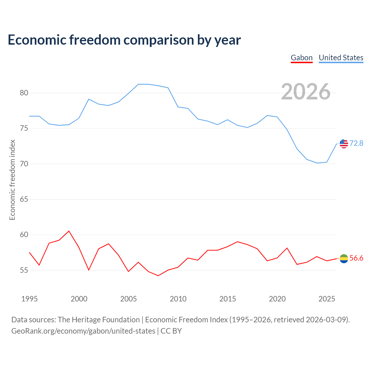 The Economic Freedom Index for Gabon is 56.6, ranking 120/197, compared to 72.8 for the United States, ranking 27/197. The chart above displays a comparison of annual changes in economic freedom indexes.