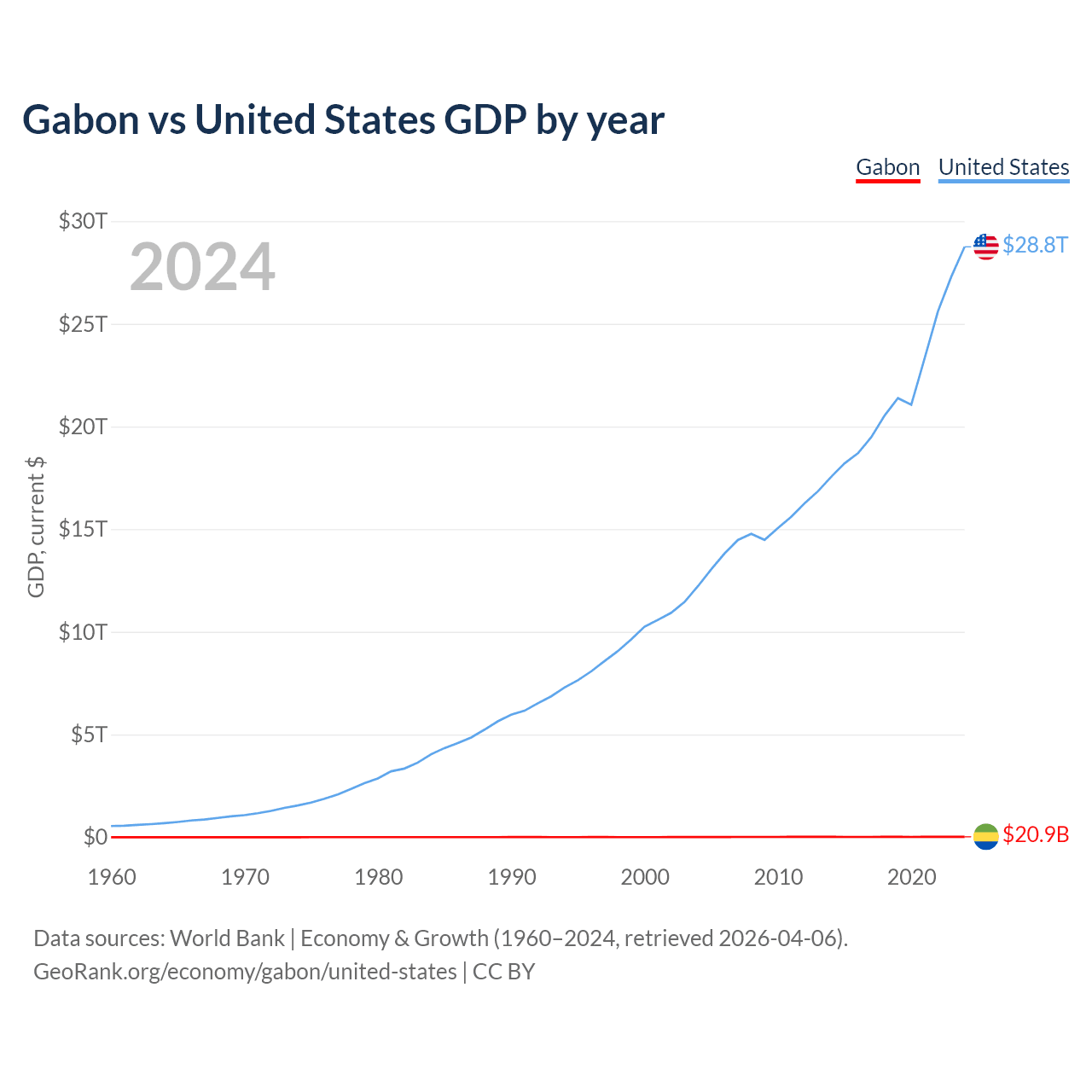 Gabon has a GDP of $20.9B compared to $28.8T for the United States, ranking 127/197 and 1/197 by economy size, respectively.