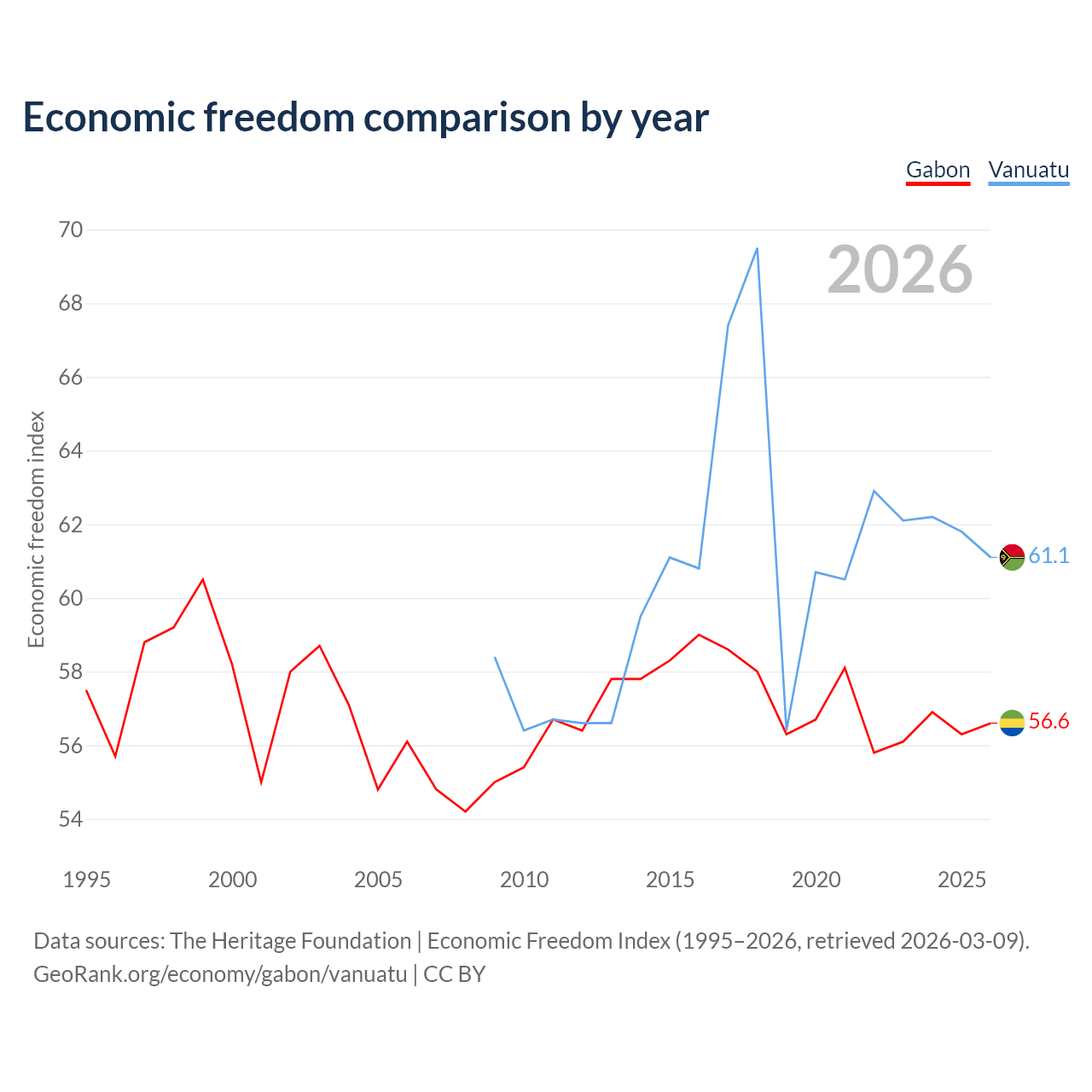 The Economic Freedom Index for Gabon is 56.6, ranking 120/197, compared to 61.1 for Vanuatu, ranking 92/197. The chart above displays a comparison of annual changes in economic freedom indexes.