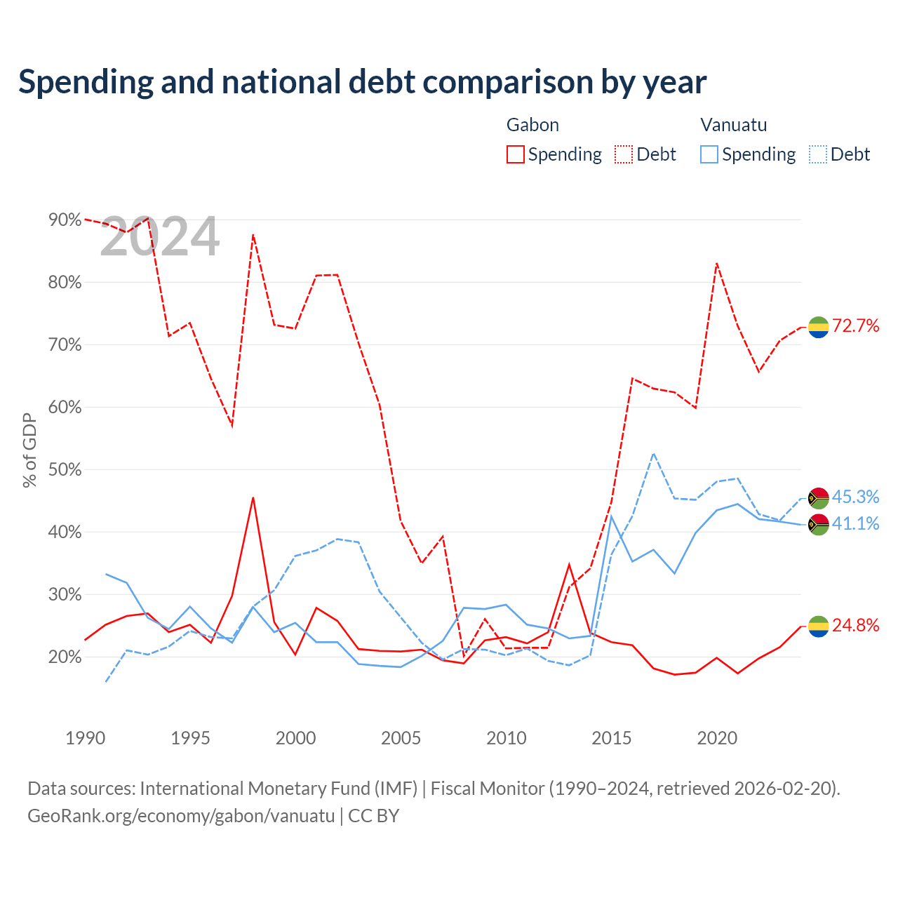 - International Monetary Fund (IMF) | Fiscal Monitor (1990–2024, retrieved 2026-02-20)