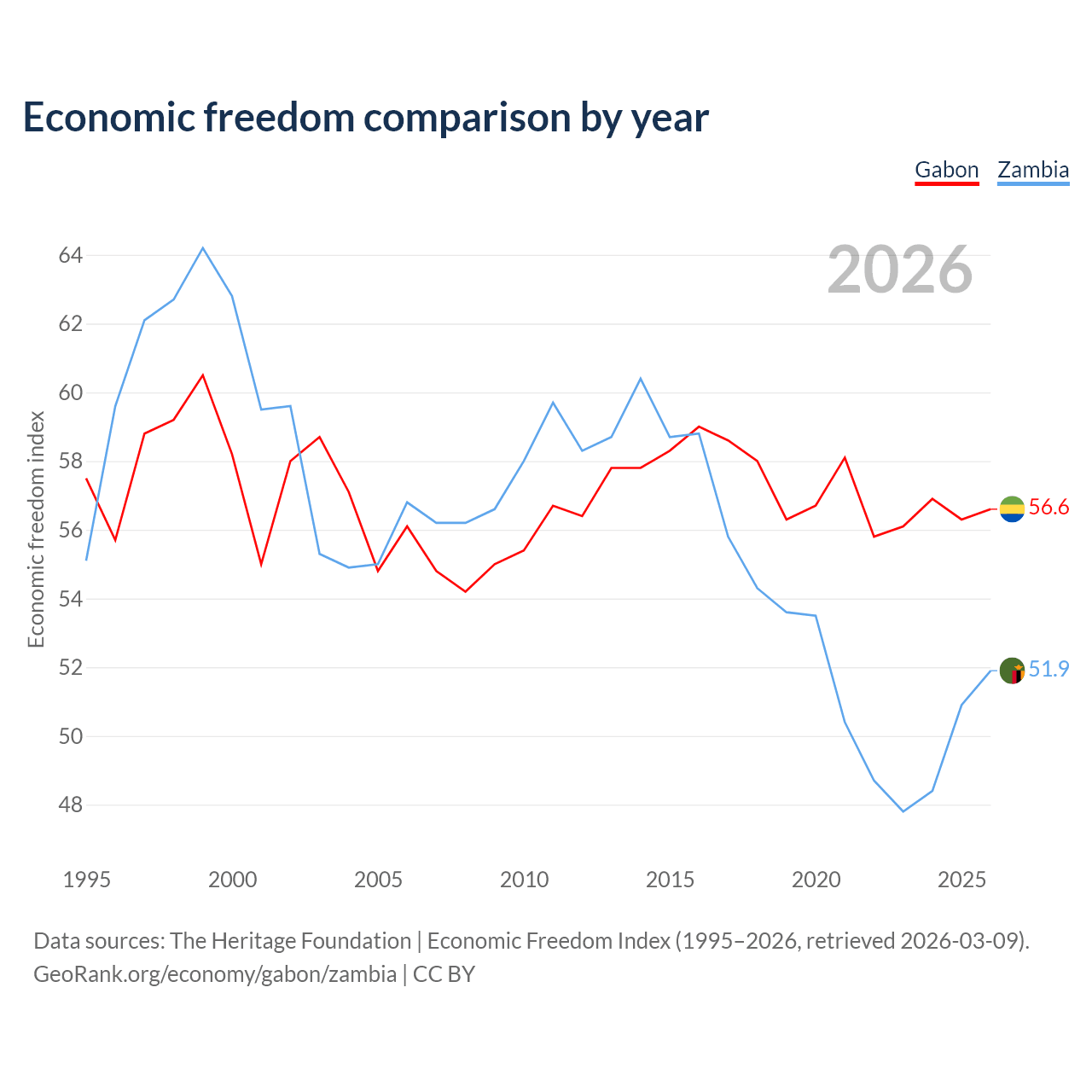 The Economic Freedom Index for Gabon is 56.6, ranking 120/197, compared to 51.9 for Zambia, ranking 152/197. The chart above displays a comparison of annual changes in economic freedom indexes.