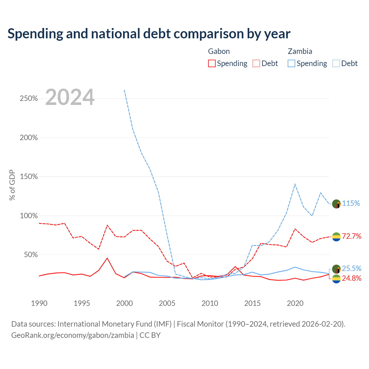 Gabon has $15.2B in government debt (72.7% of GDP), compared to $29.1B (114.9% of GDP) in Zambia.