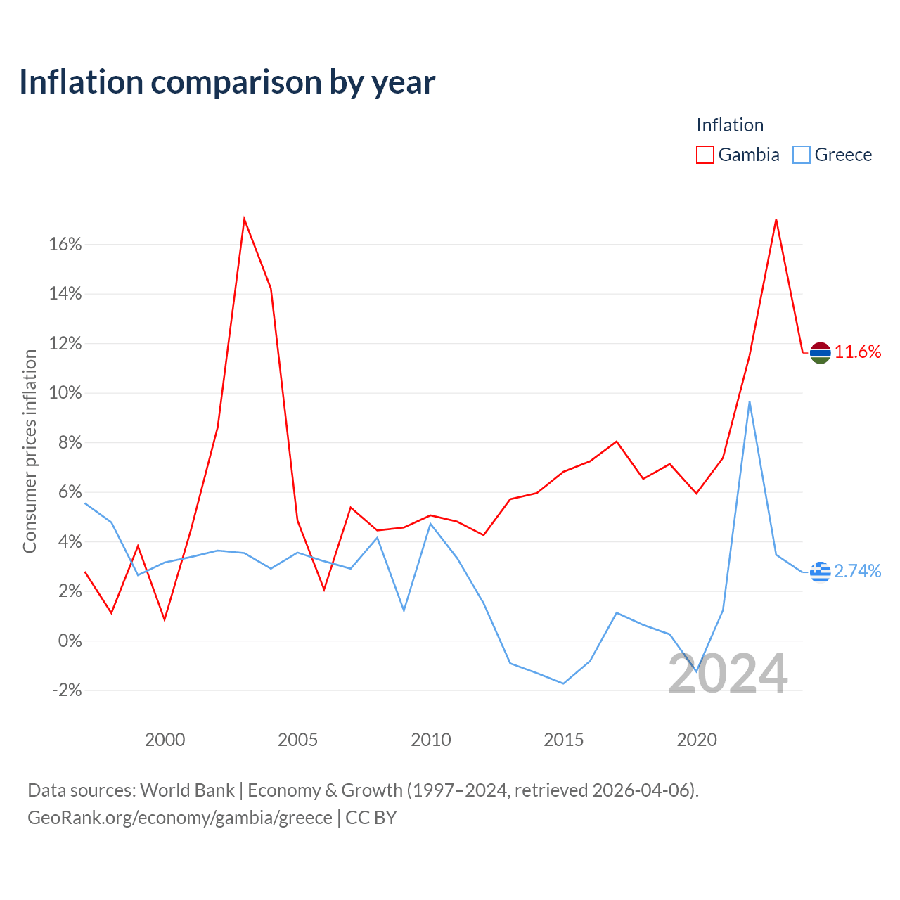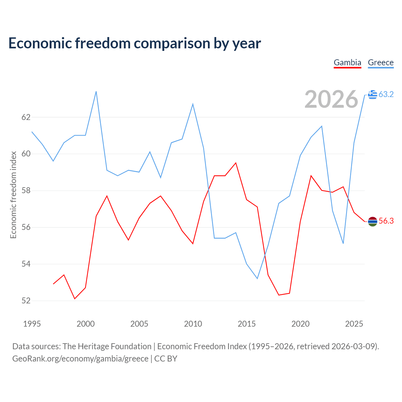 The Economic Freedom Index for the Gambia is 56.3, ranking 123/197, compared to 63.2 for Greece, ranking 82/197. The chart above displays a comparison of annual changes in economic freedom indexes.