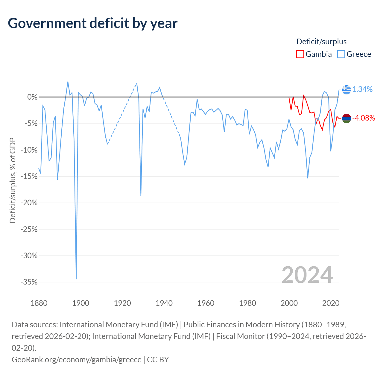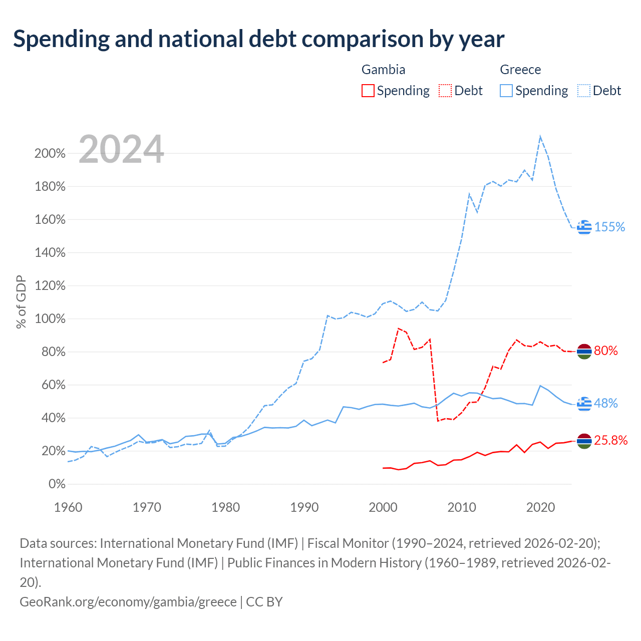 The Gambia has $1.92B in government debt (80% of GDP), compared to $397B (154.8% of GDP) in Greece.