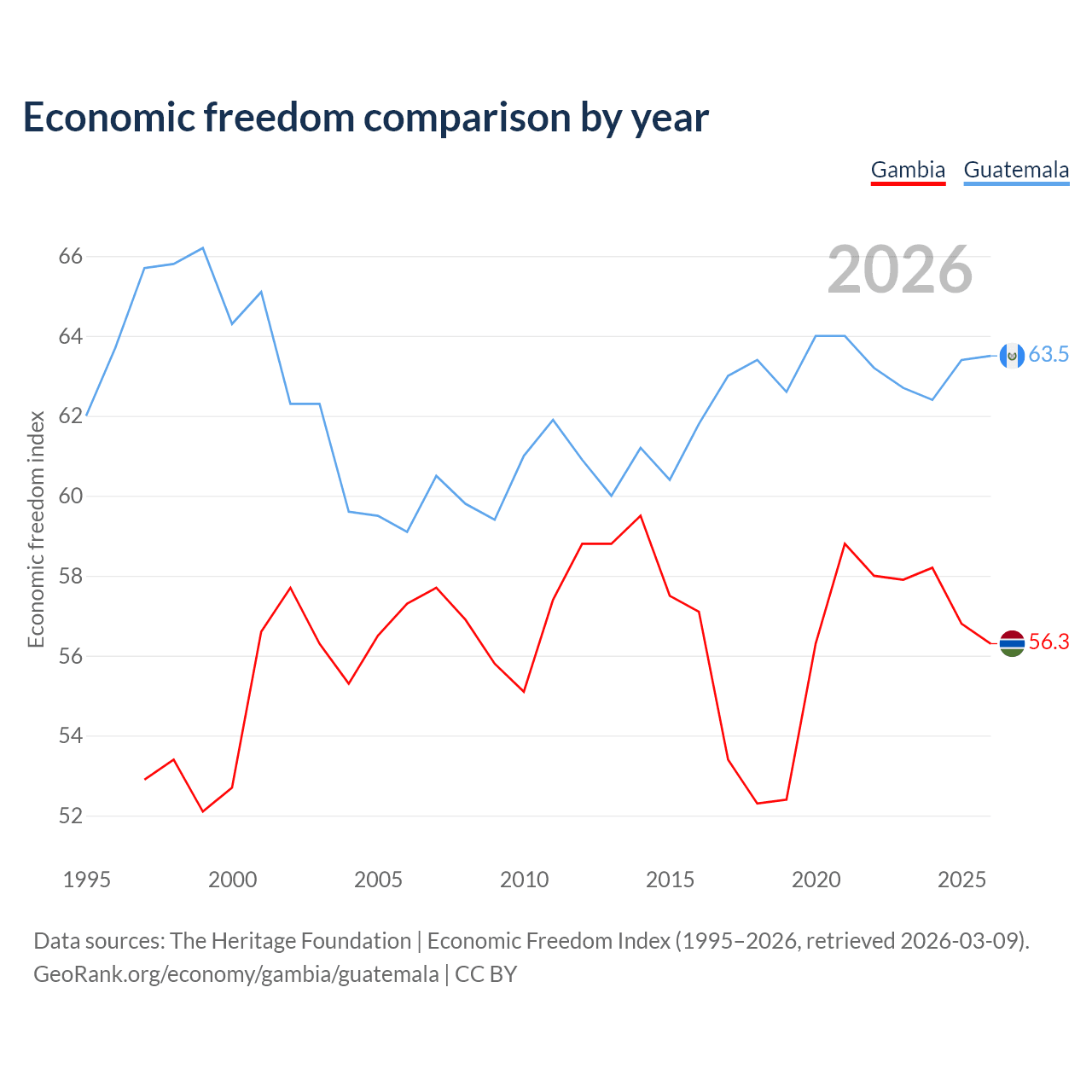 The Economic Freedom Index for the Gambia is 56.3, ranking 123/197, compared to 63.5 for Guatemala, ranking 79/197. The chart above displays a comparison of annual changes in economic freedom indexes.