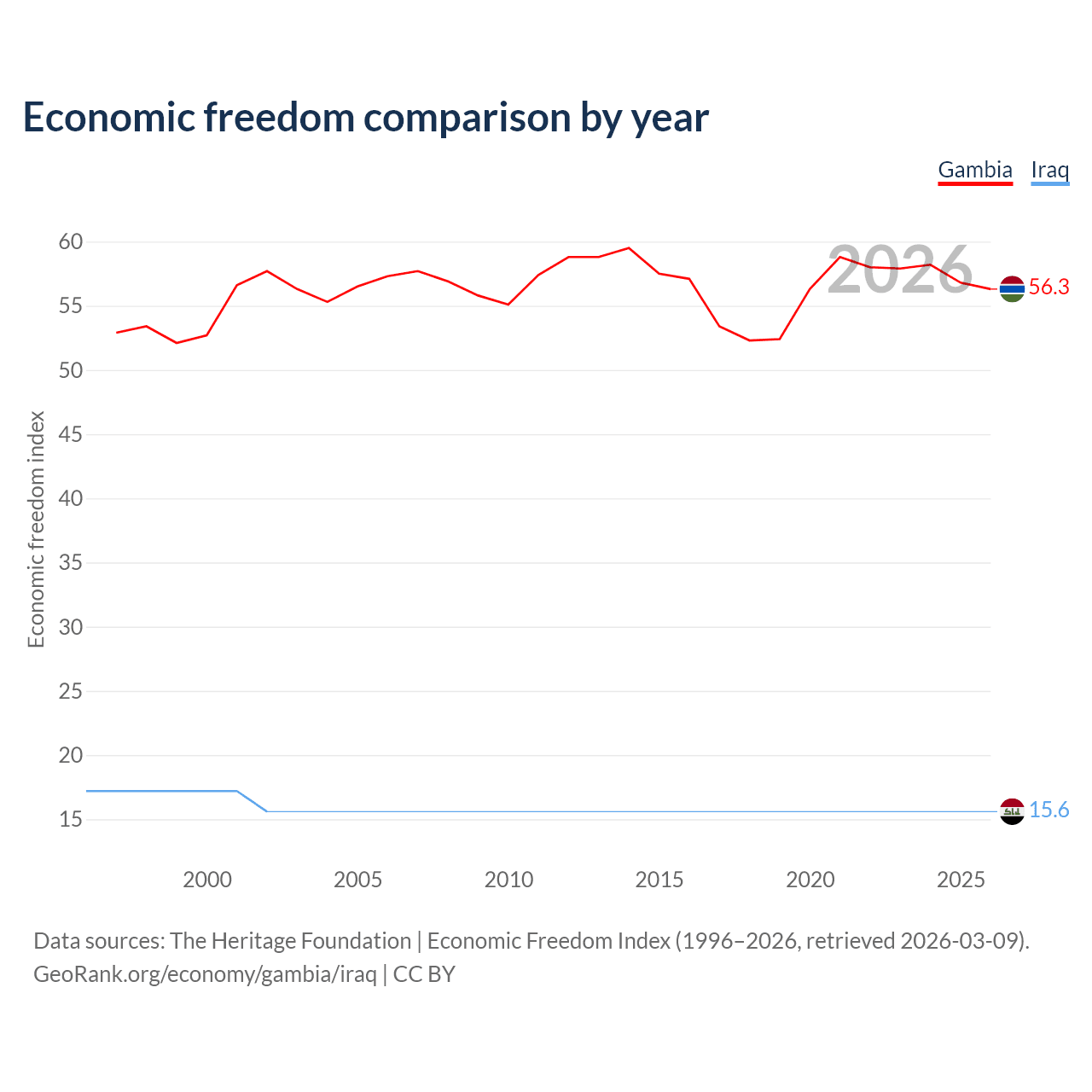 The Economic Freedom Index for the Gambia is 56.3, ranking 123/197, compared to 15.6 for Iraq, ranking 196/197. The chart above displays a comparison of annual changes in economic freedom indexes.
