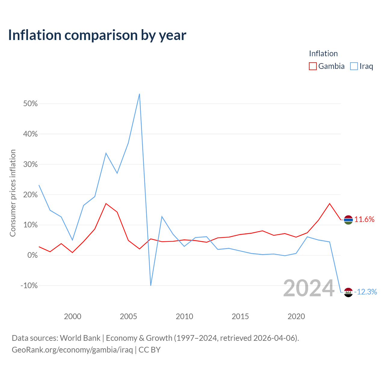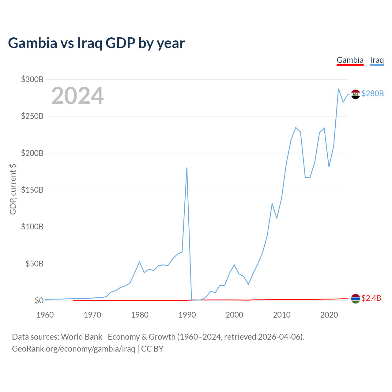 The Gambia has a GDP of $2.4B compared to $280B for Iraq, ranking 174/197 and 50/197 by economy size, respectively.