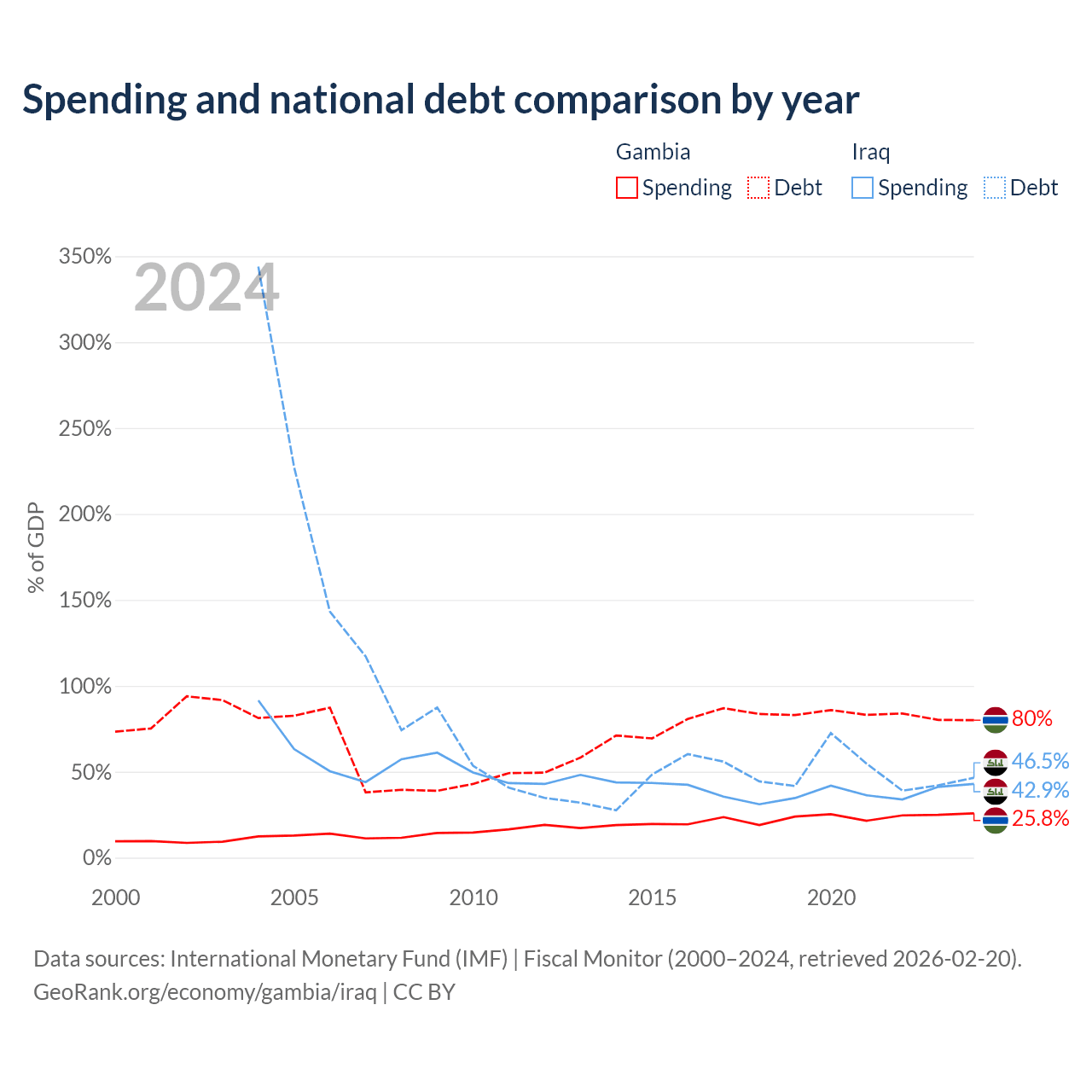 The Gambia has $1.92B in government debt (80% of GDP), compared to $130B (46.5% of GDP) in Iraq.