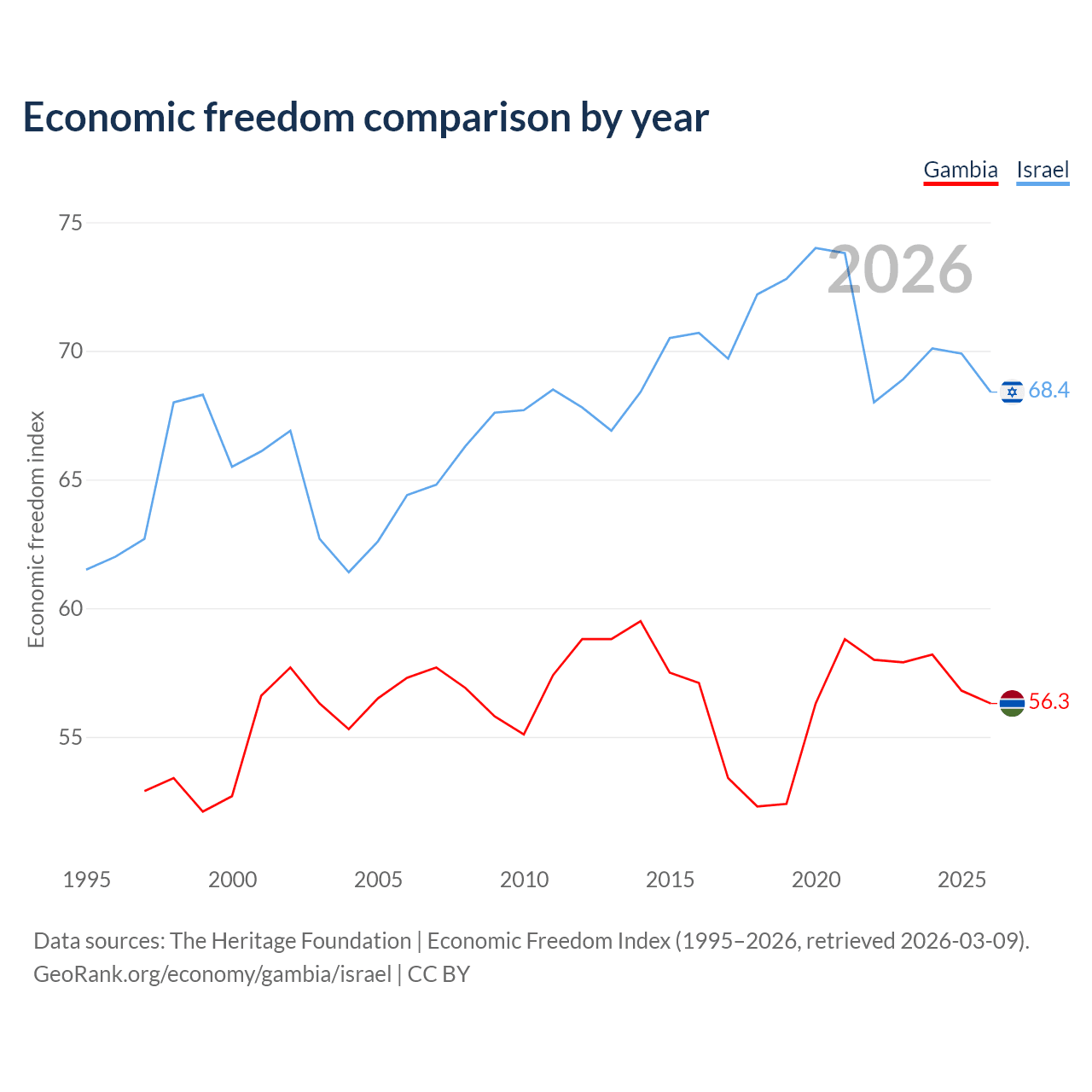 The Economic Freedom Index for the Gambia is 56.3, ranking 123/197, compared to 68.4 for Israel, ranking 47/197. The chart above displays a comparison of annual changes in economic freedom indexes.