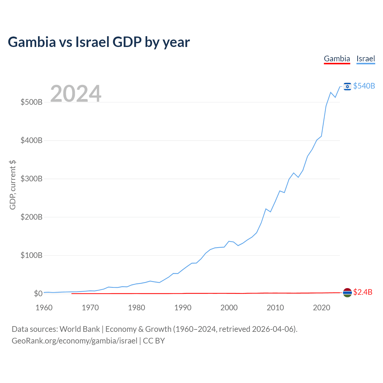 The Gambia has a GDP of $2.4B compared to $540B for Israel, ranking 174/197 and 29/197 by economy size, respectively.