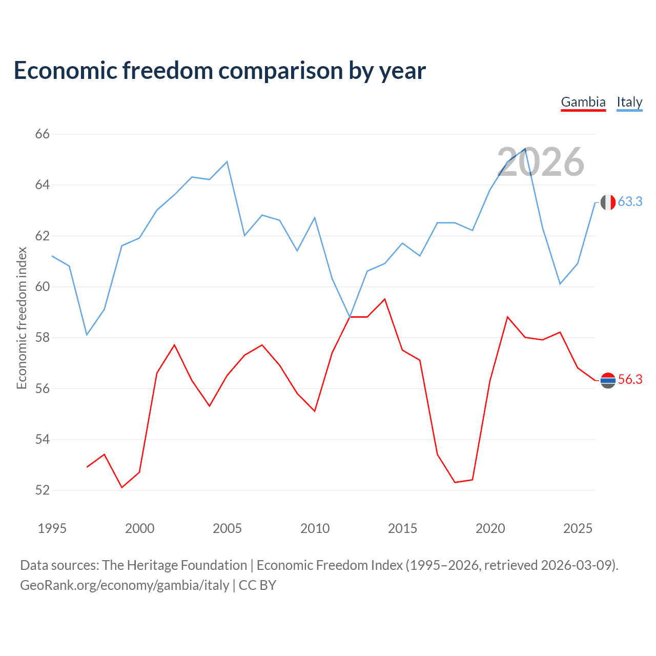 The Economic Freedom Index for the Gambia is 56.3, ranking 123/197, compared to 63.3 for Italy, ranking 80/197. The chart above displays a comparison of annual changes in economic freedom indexes.