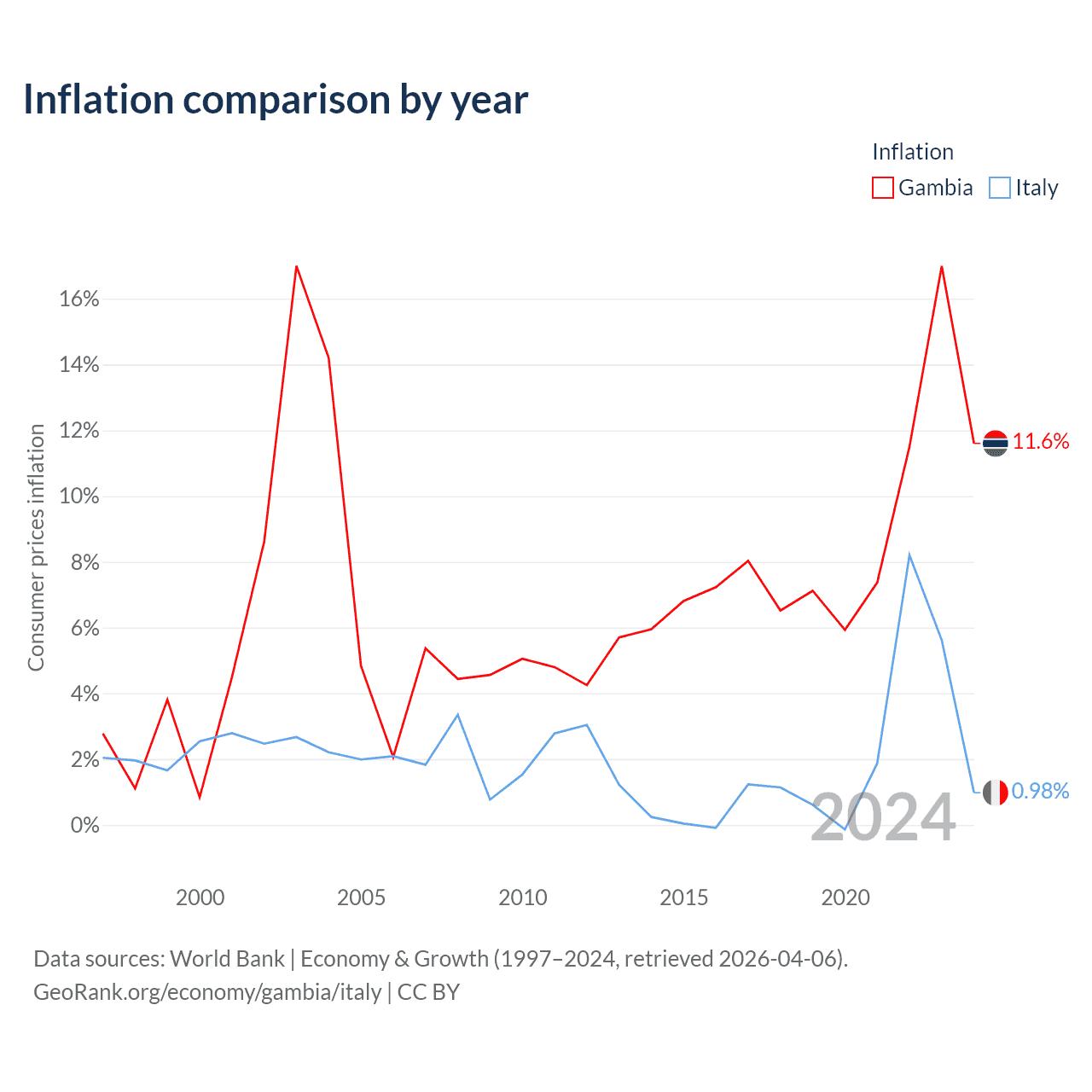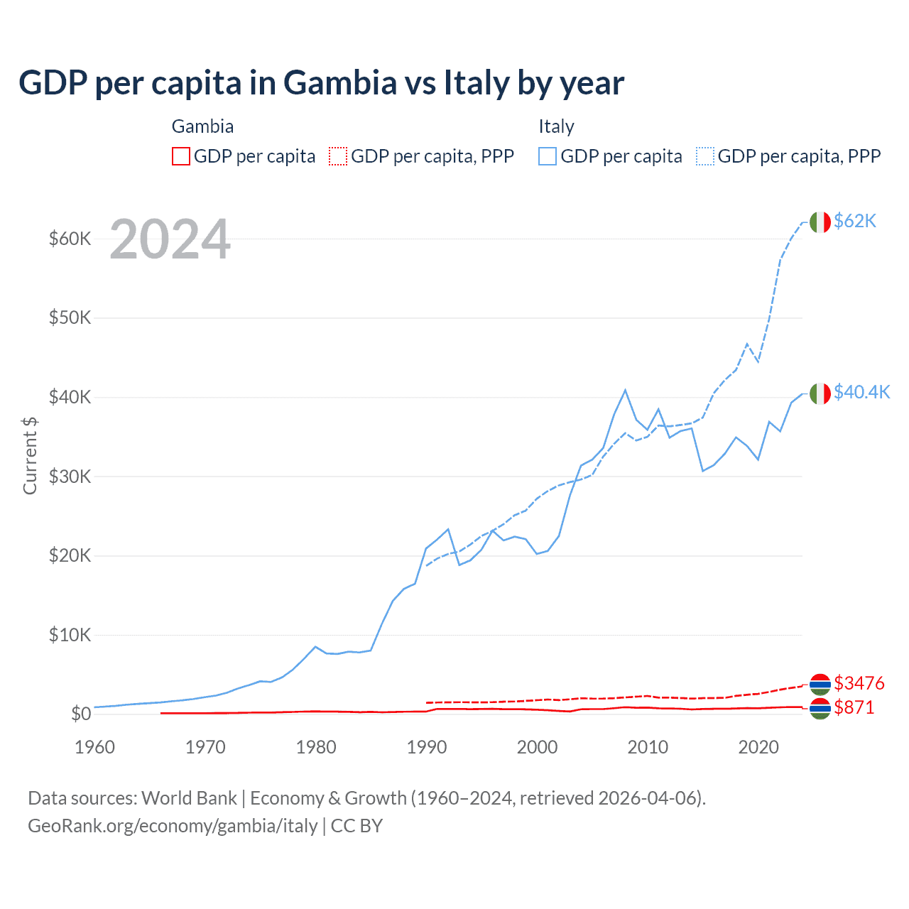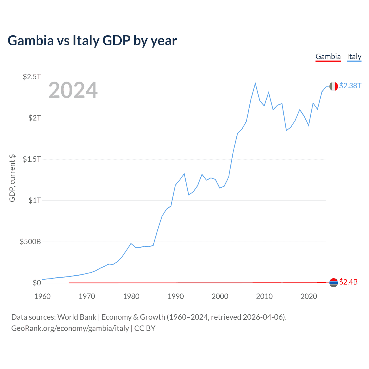 The Gambia has a GDP of $2.4B compared to $2.38T for Italy, ranking 174/197 and 8/197 by economy size, respectively.