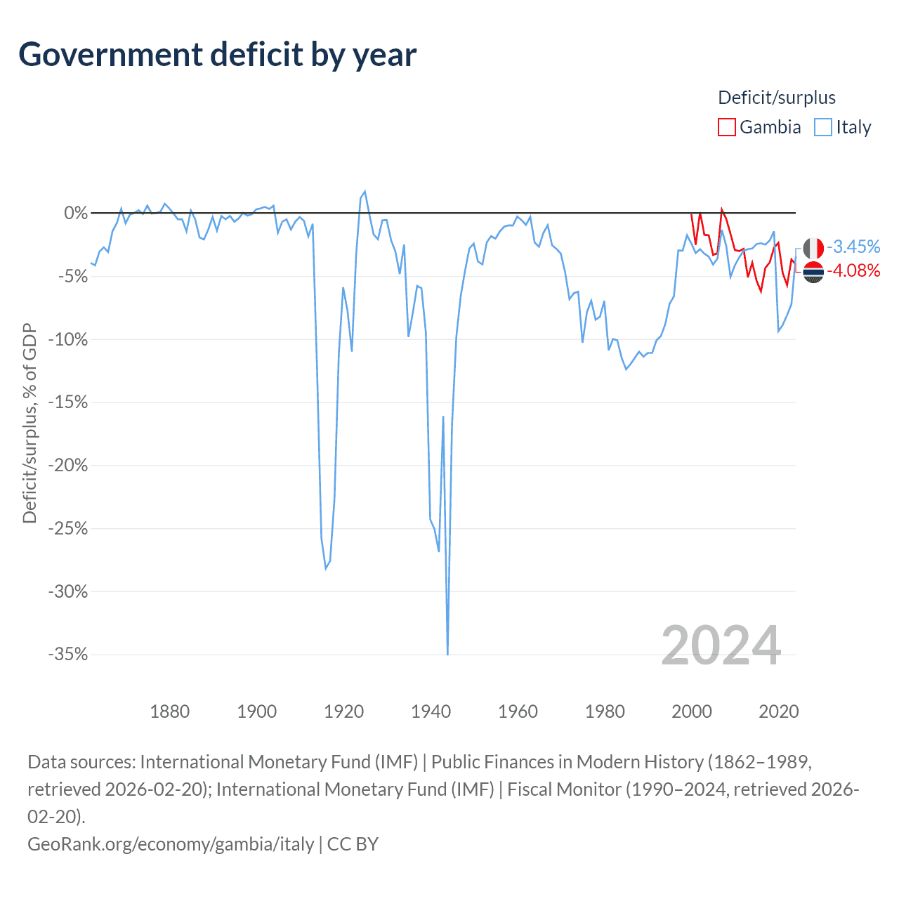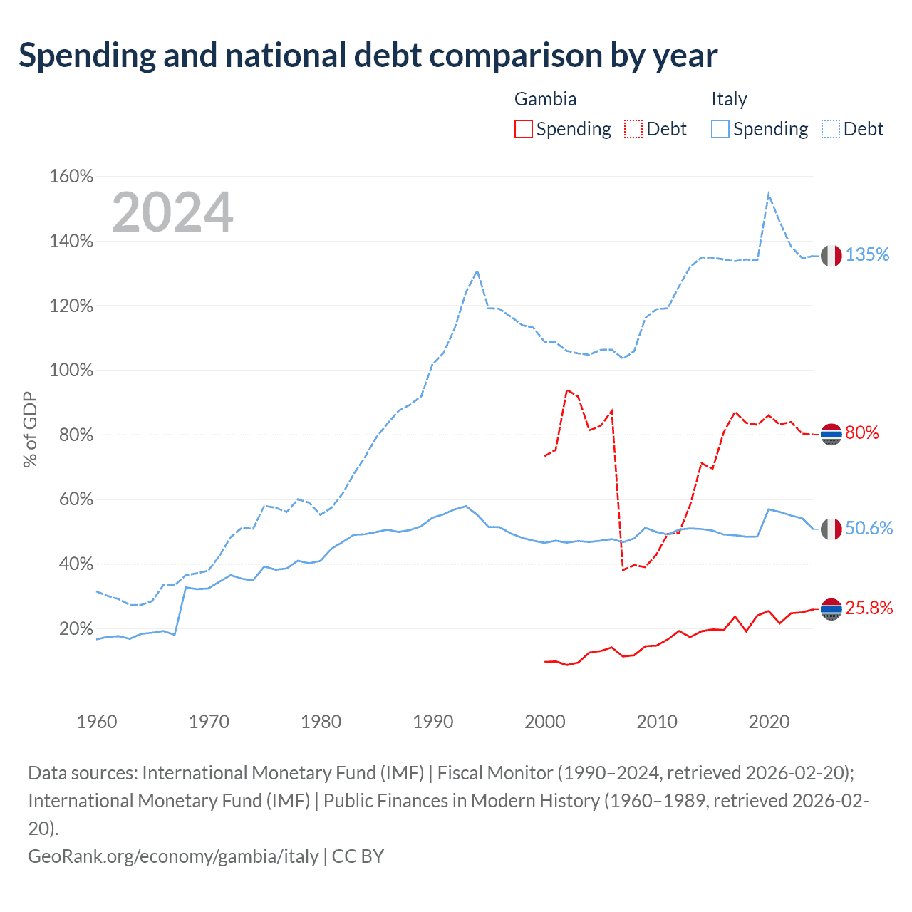 The Gambia has $1.92B in government debt (80% of GDP), compared to $3.22T (135.3% of GDP) in Italy.