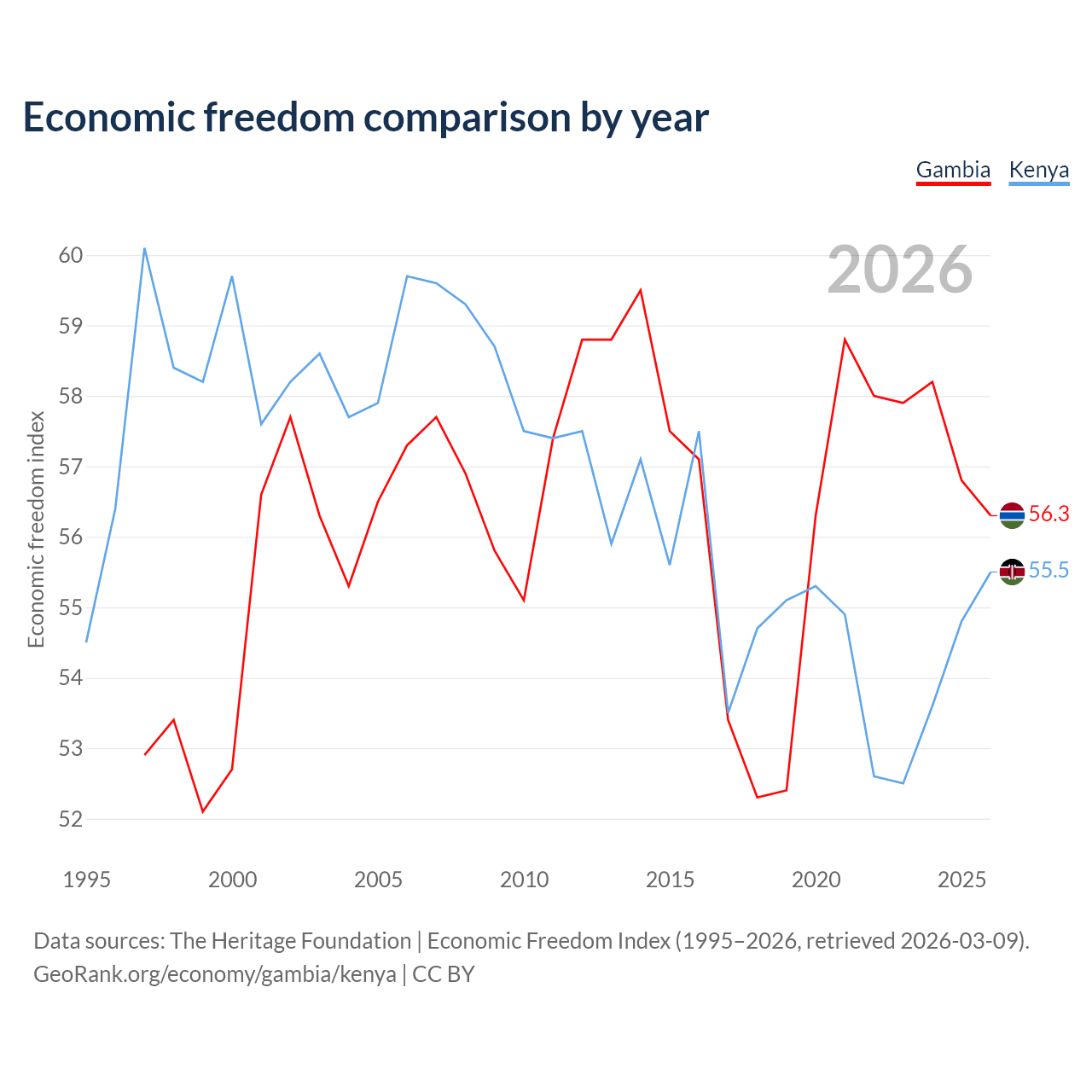 The Economic Freedom Index for the Gambia is 56.3, ranking 123/197, compared to 55.5 for Kenya, ranking 128/197. The chart above displays a comparison of annual changes in economic freedom indexes.