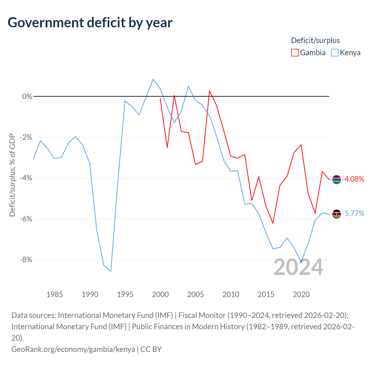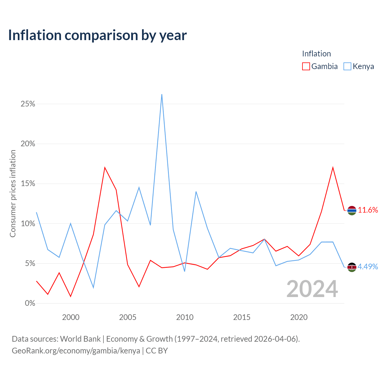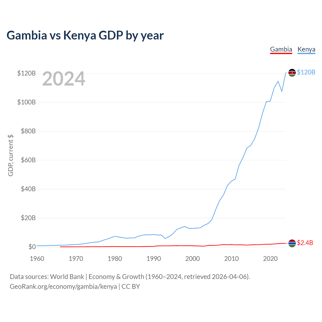 The Gambia has a GDP of $2.4B compared to $120B for Kenya, ranking 174/197 and 64/197 by economy size, respectively.