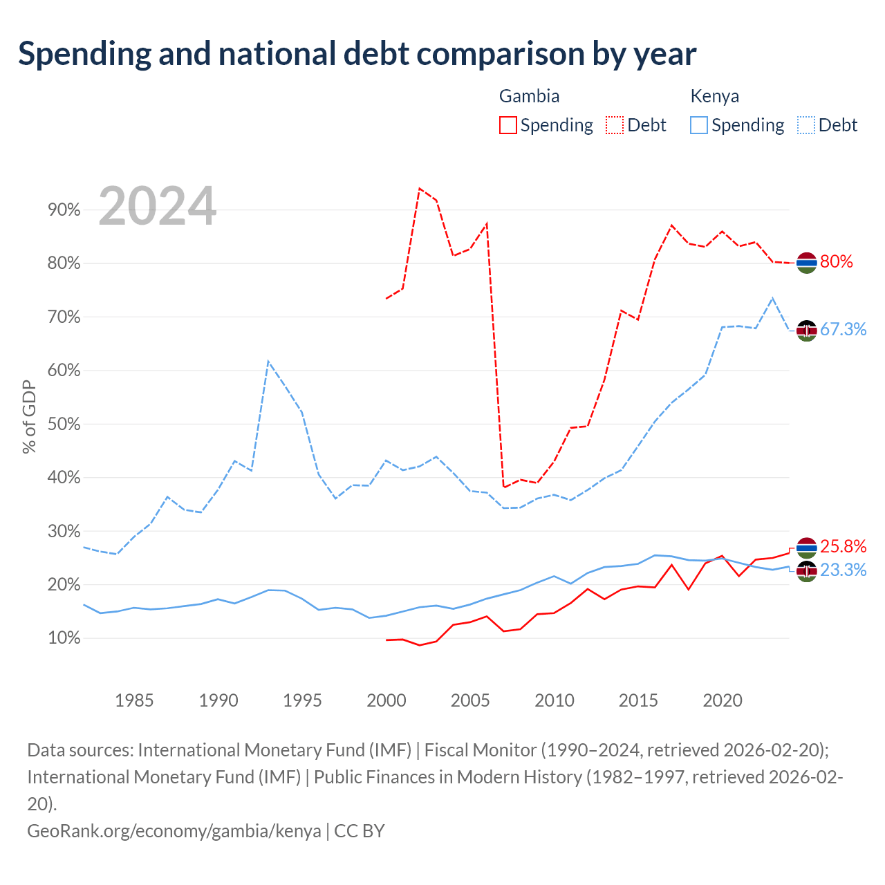 The Gambia has $1.92B in government debt (80% of GDP), compared to $81B (67.3% of GDP) in Kenya.
