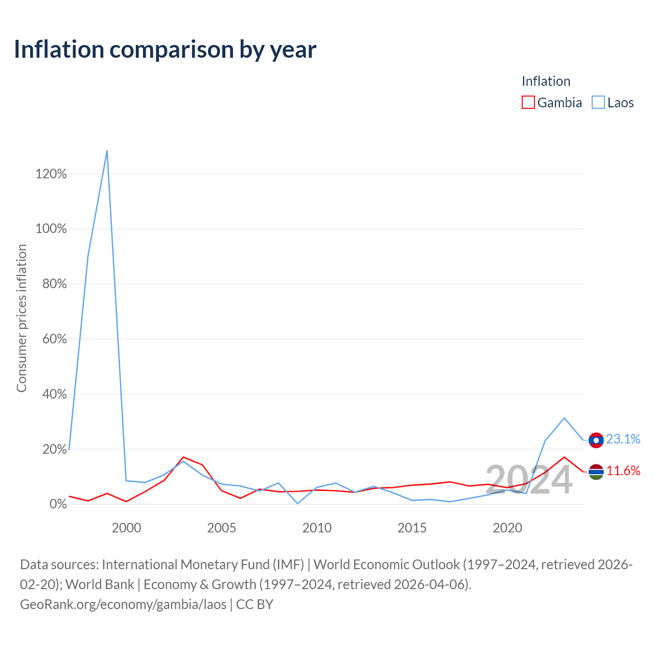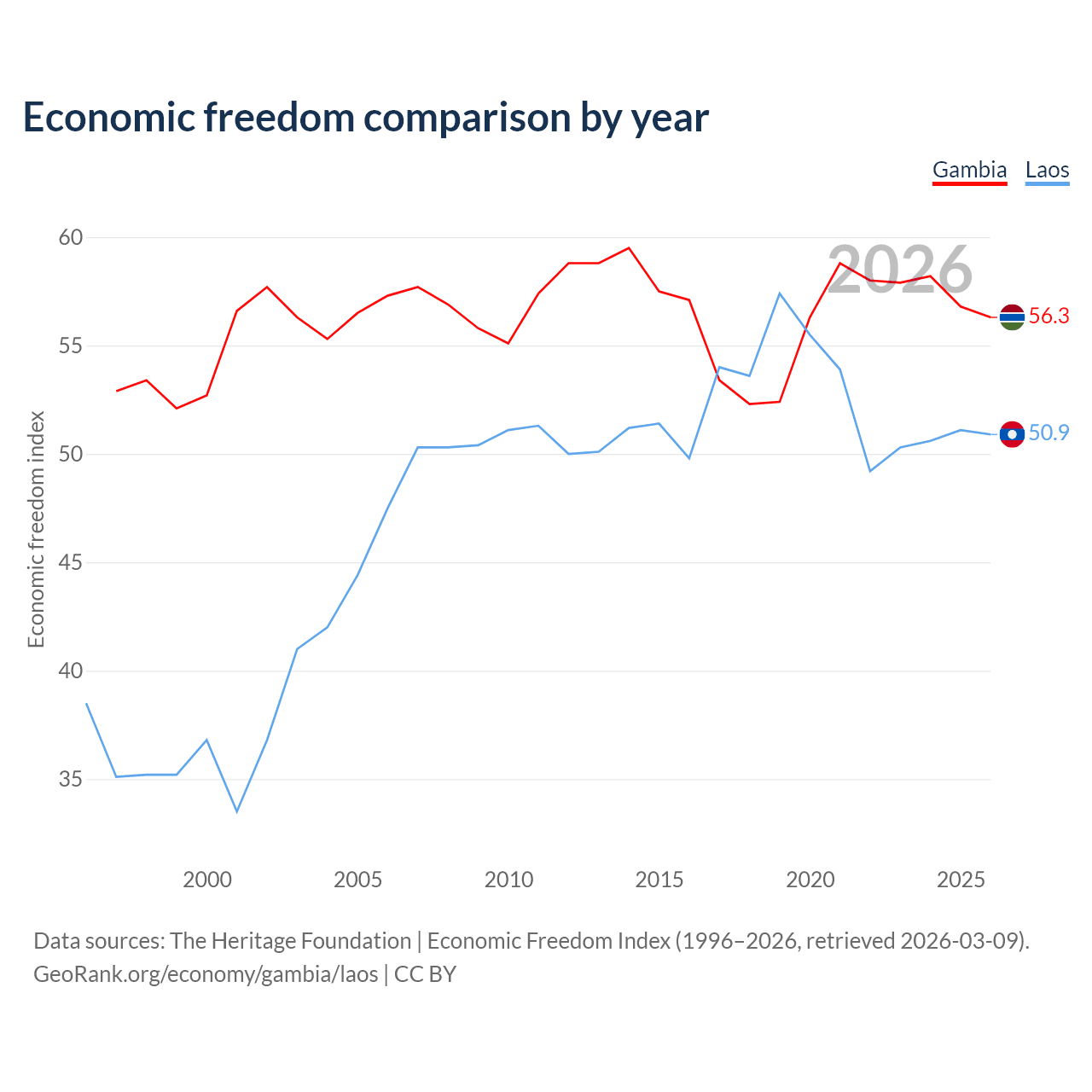 The Economic Freedom Index for the Gambia is 56.3, ranking 123/197, compared to 50.9 for Laos, ranking 157/197. The chart above displays a comparison of annual changes in economic freedom indexes.
