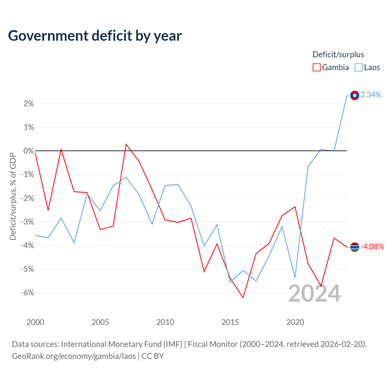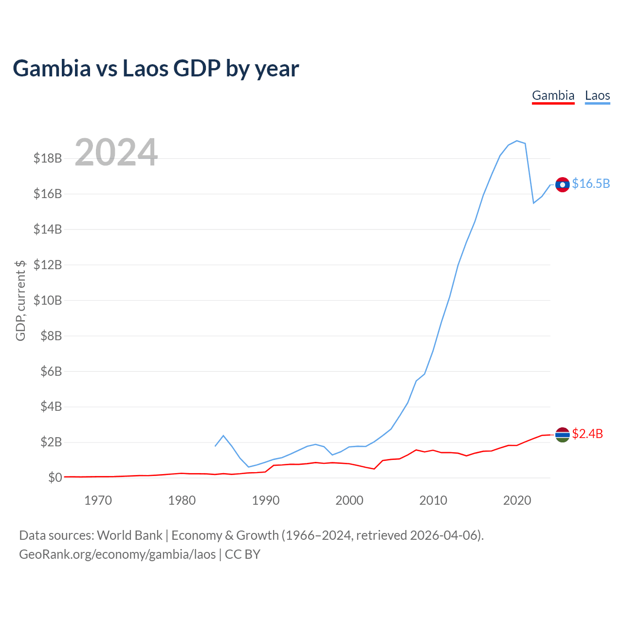 The Gambia has a GDP of $2.4B compared to $16.5B for Laos, ranking 174/197 and 139/197 by economy size, respectively.