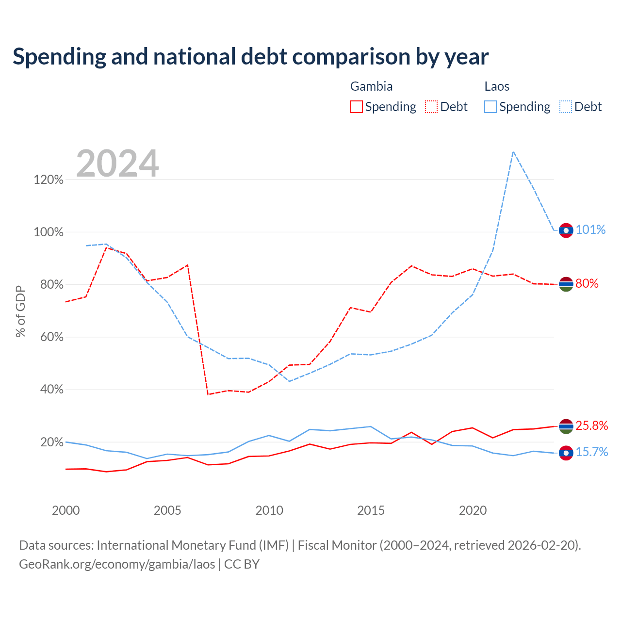 The Gambia has $1.92B in government debt (80% of GDP), compared to $16.6B (100.5% of GDP) in Laos.