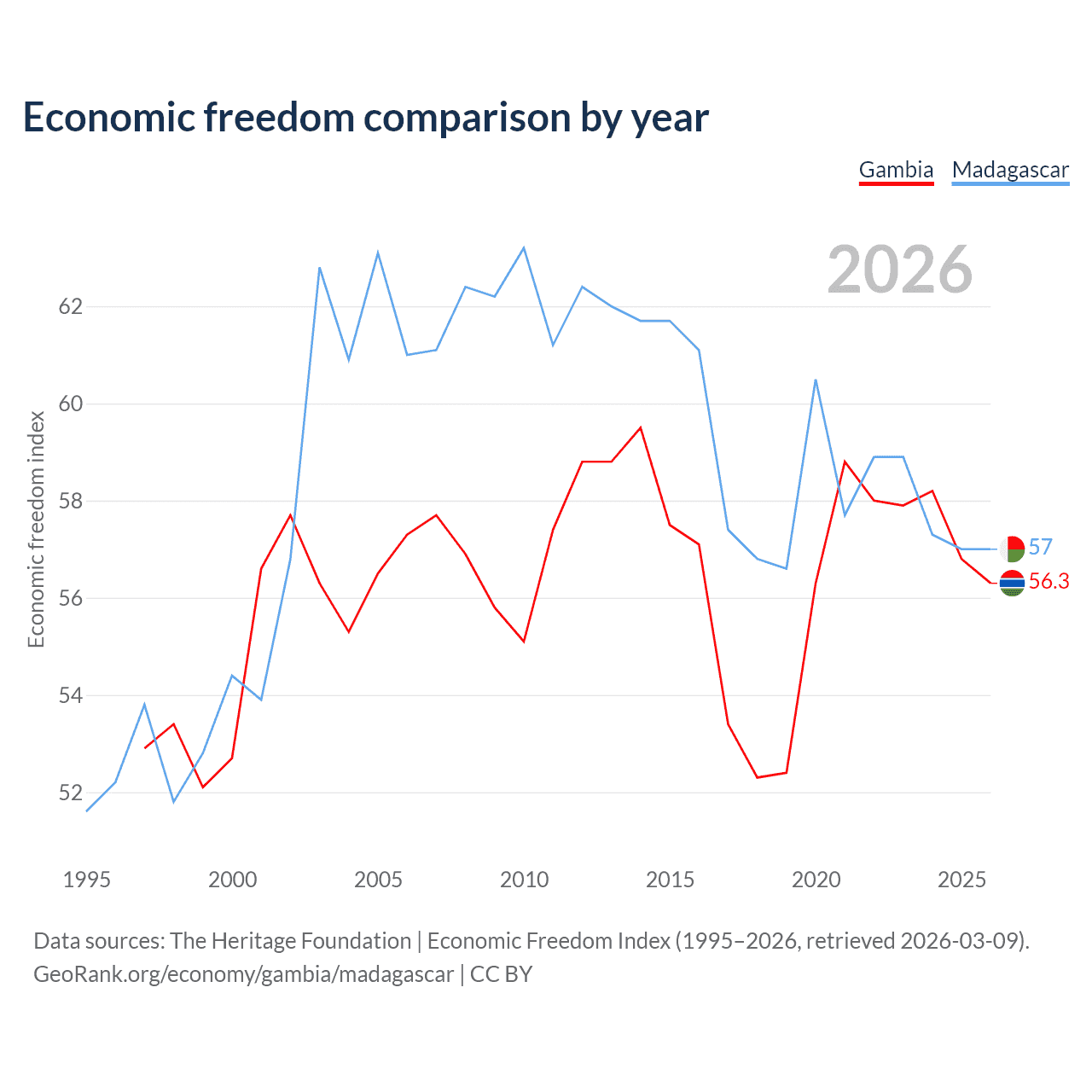 Data sources: The Heritage Foundation | Economic Freedom Index (1995–2026, retrieved 2026-03-09).