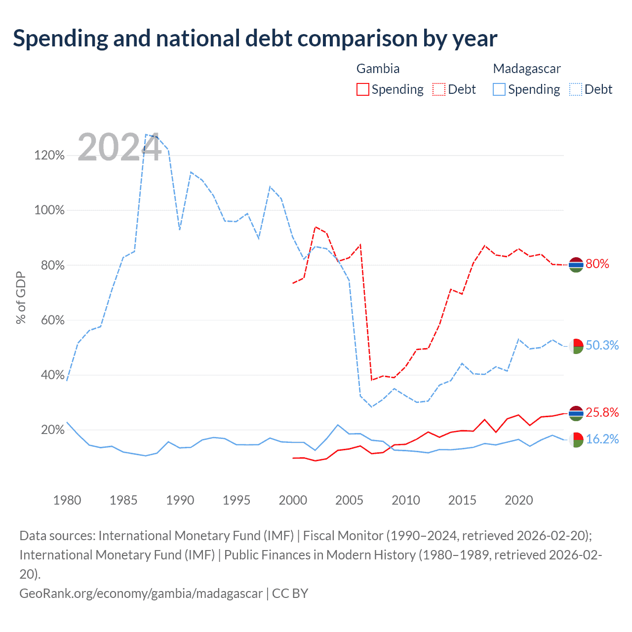 The Gambia has $1.92B in government debt (80% of GDP), compared to $8.77B (50.3% of GDP) in Madagascar.