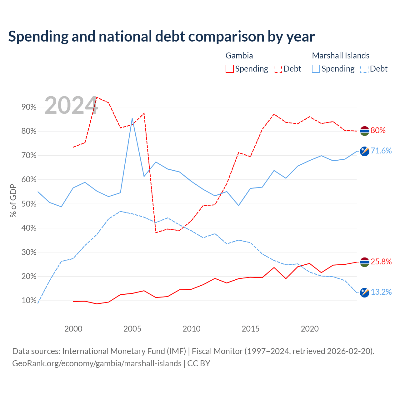 The Gambia has $1.92B in government debt (80% of GDP), compared to $38.4M (13.2% of GDP) in the Marshall Islands.