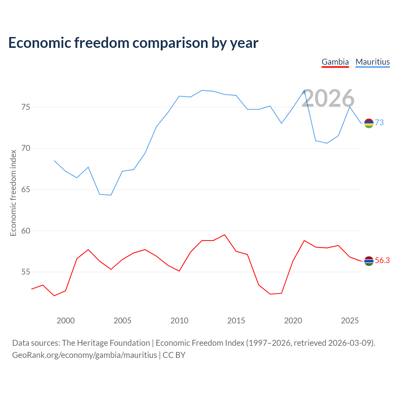 The Economic Freedom Index for the Gambia is 56.3, ranking 123/197, compared to 73 for Mauritius, ranking 26/197. The chart above displays a comparison of annual changes in economic freedom indexes.