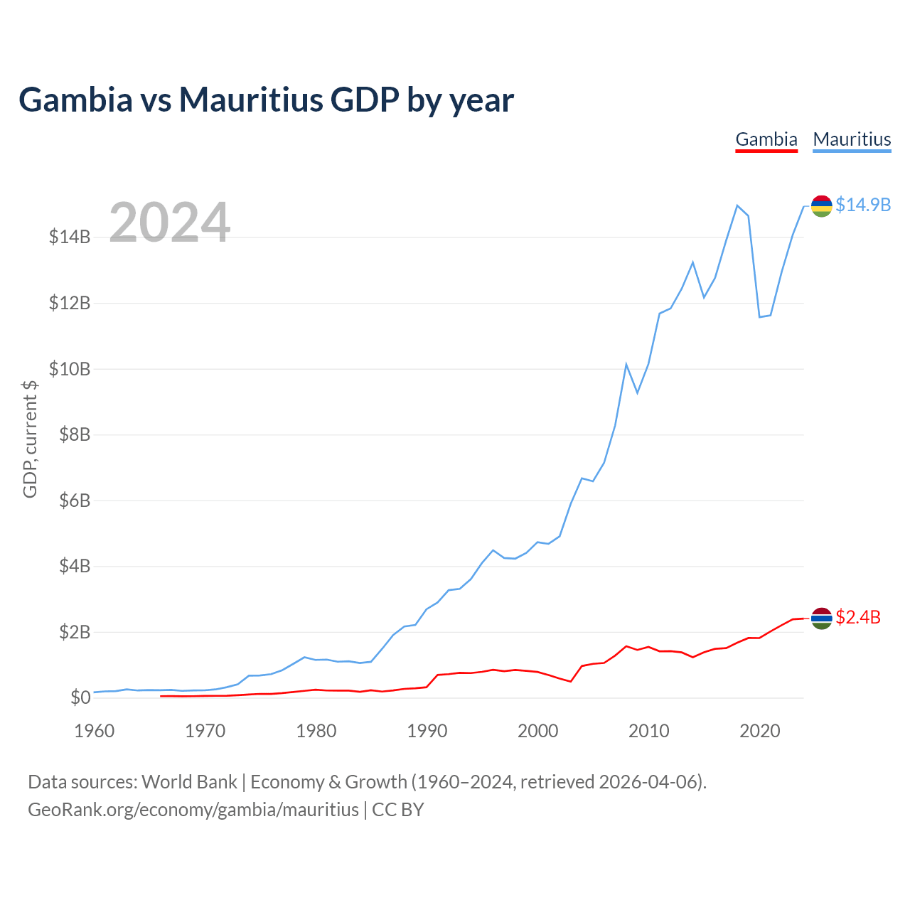 The Gambia has a GDP of $2.4B compared to $14.9B for Mauritius, ranking 174/197 and 143/197 by economy size, respectively.