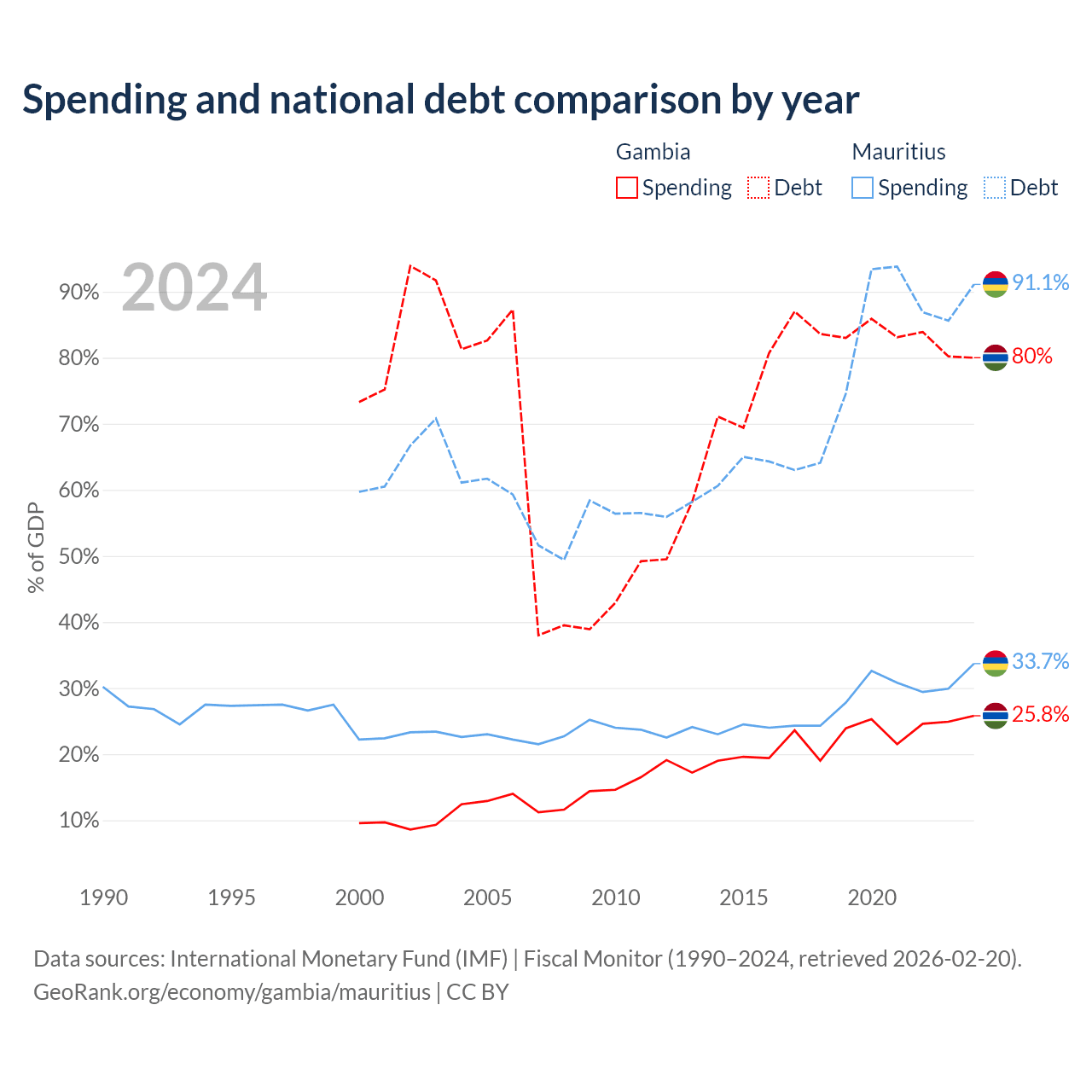 The Gambia has $1.92B in government debt (80% of GDP), compared to $13.6B (91.1% of GDP) in Mauritius.