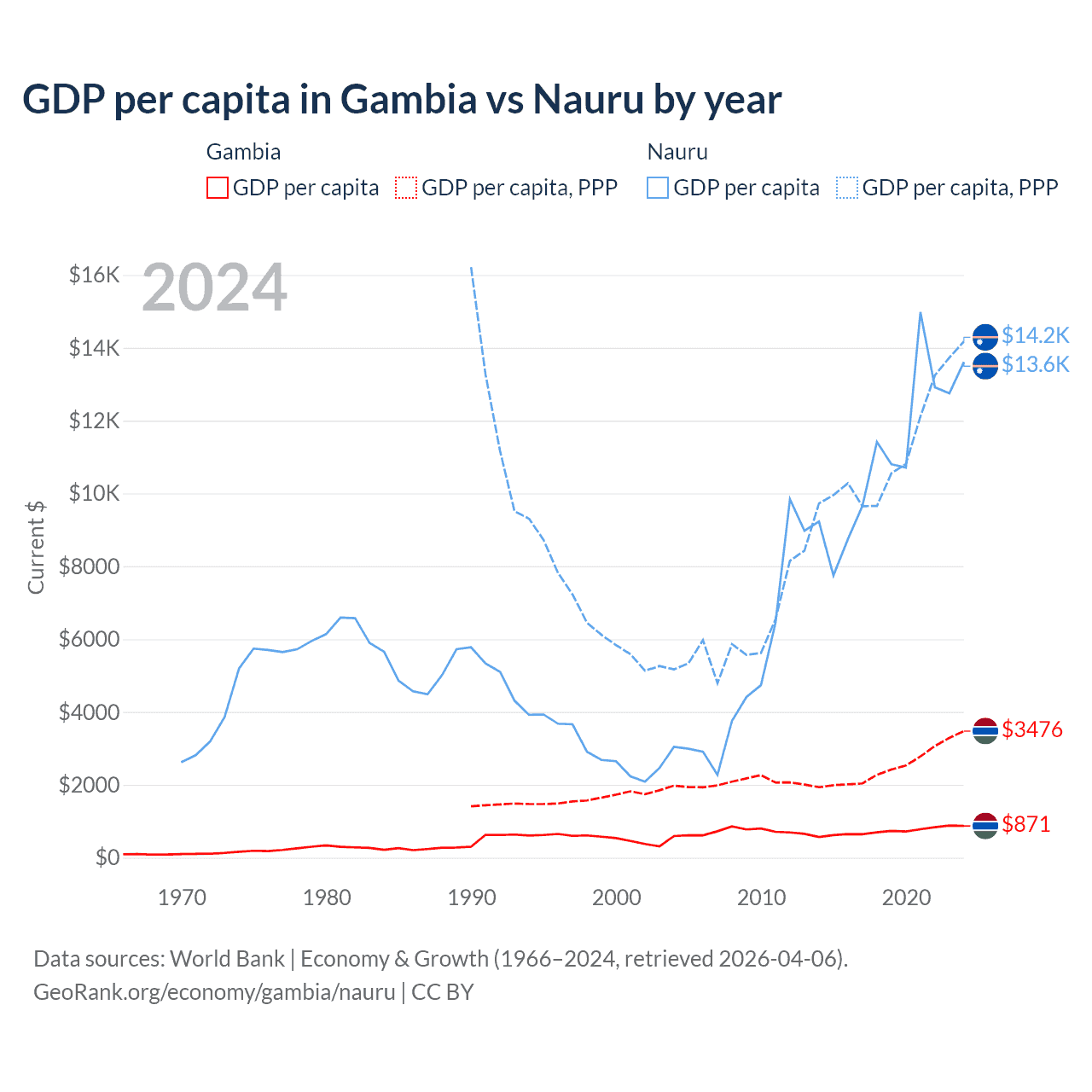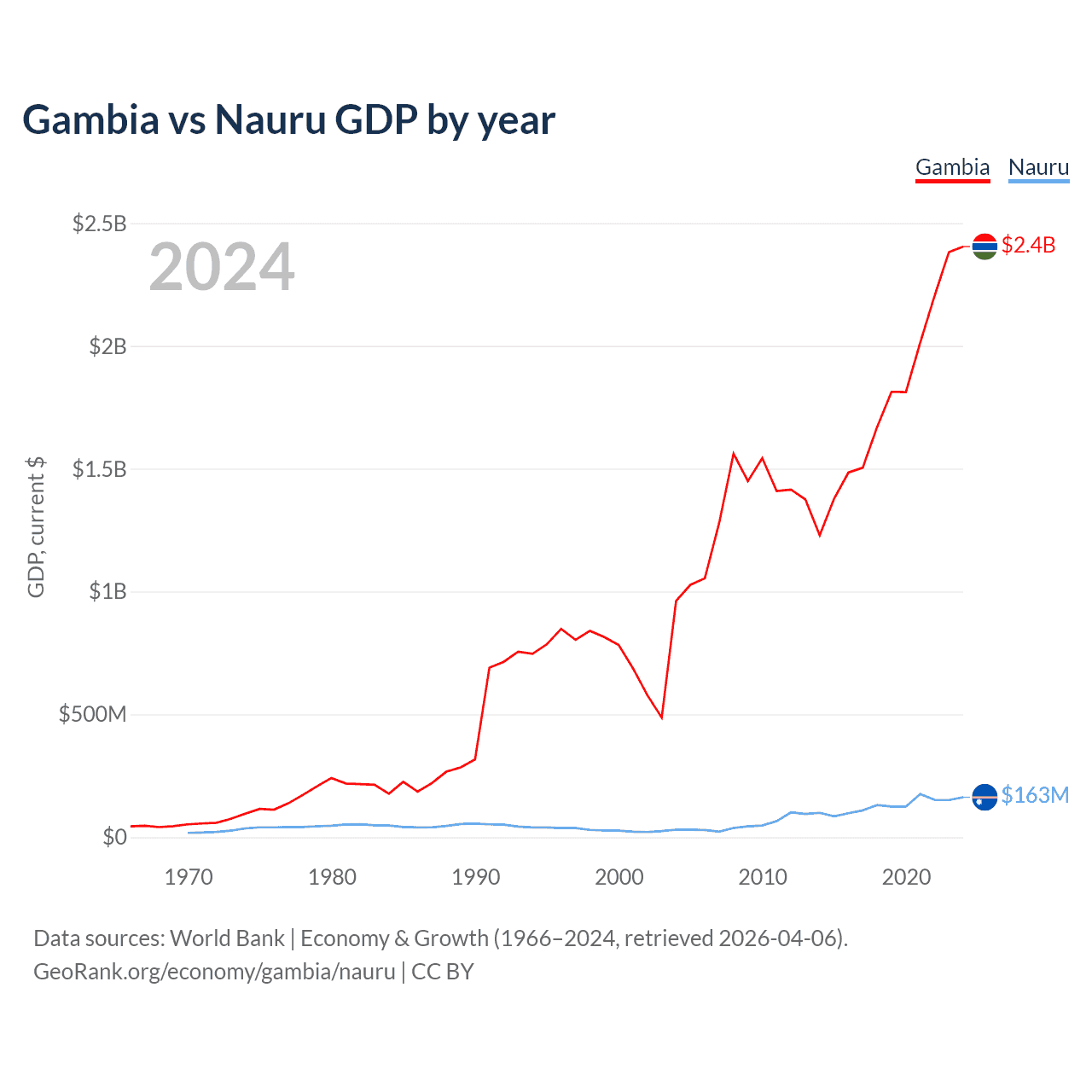 The Gambia has a GDP of $2.4B compared to $163M for Nauru, ranking 174/197 and 195/197 by economy size, respectively.