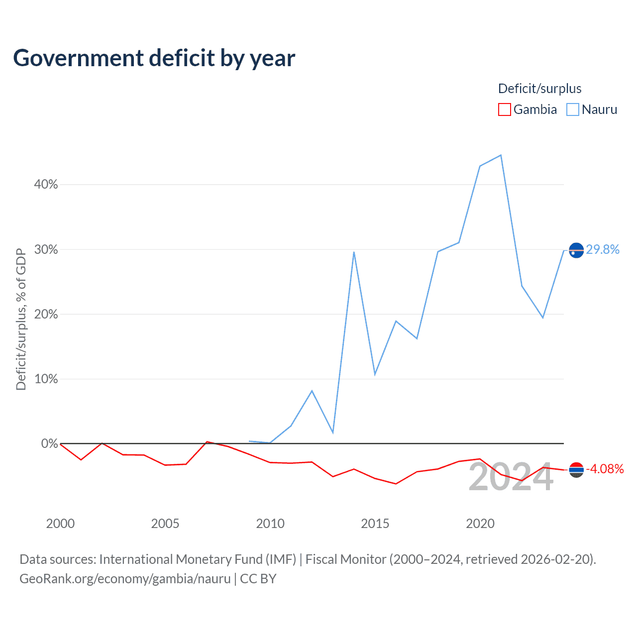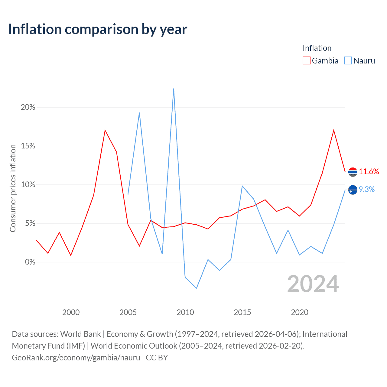Over the past 20 years, the Gambia has recorded an average annual inflation rate of 6.8%, compared with 4.84% in Nauru. In 2024, inflation was 11.6% in the Gambia and 9.3% in Nauru.