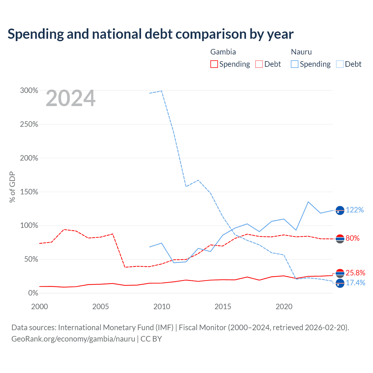The Gambia has $1.92B in government debt (80% of GDP), compared to $28.3M (17.4% of GDP) in Nauru.