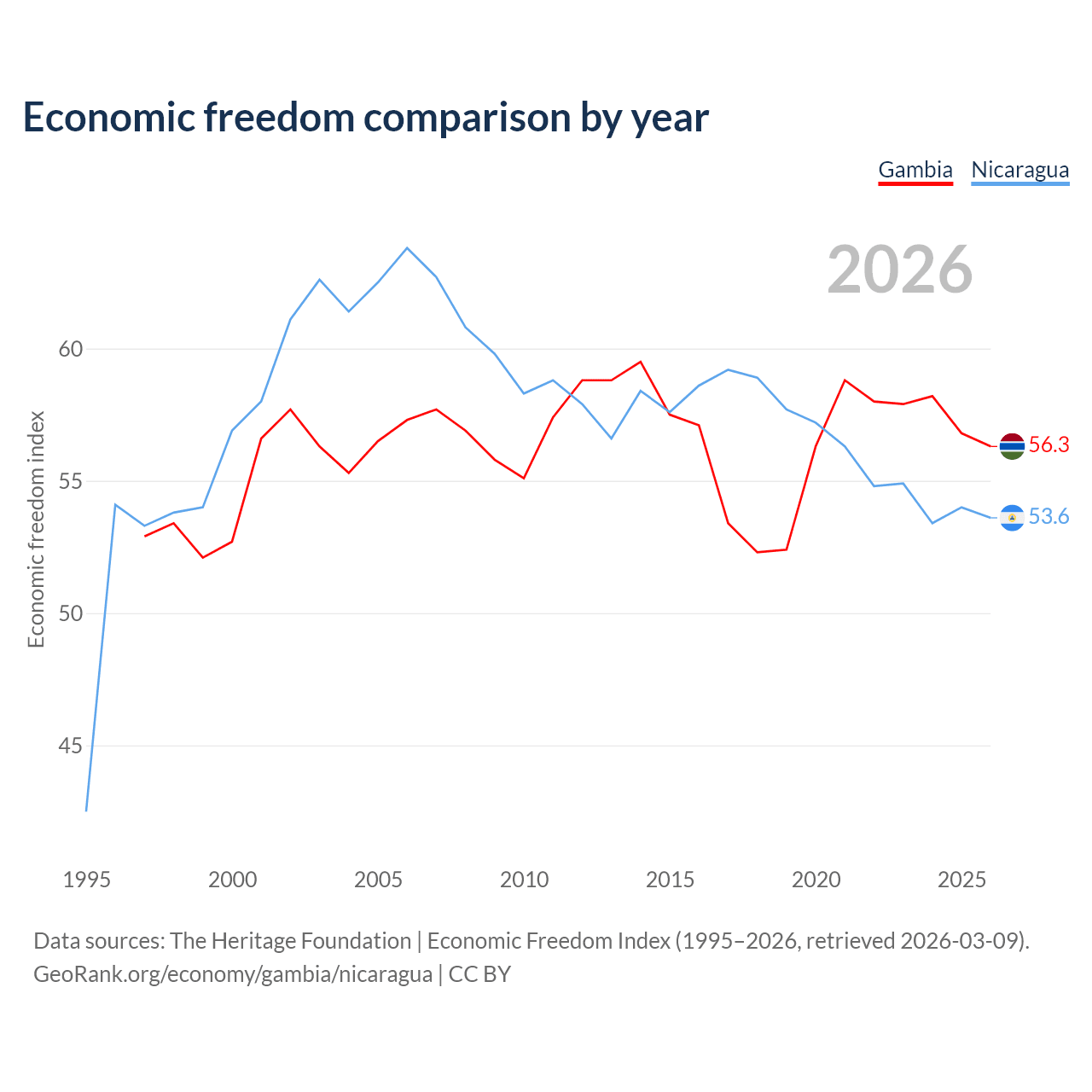 The Economic Freedom Index for the Gambia is 56.3, ranking 123/197, compared to 53.6 for Nicaragua, ranking 139/197. The chart above displays a comparison of annual changes in economic freedom indexes.