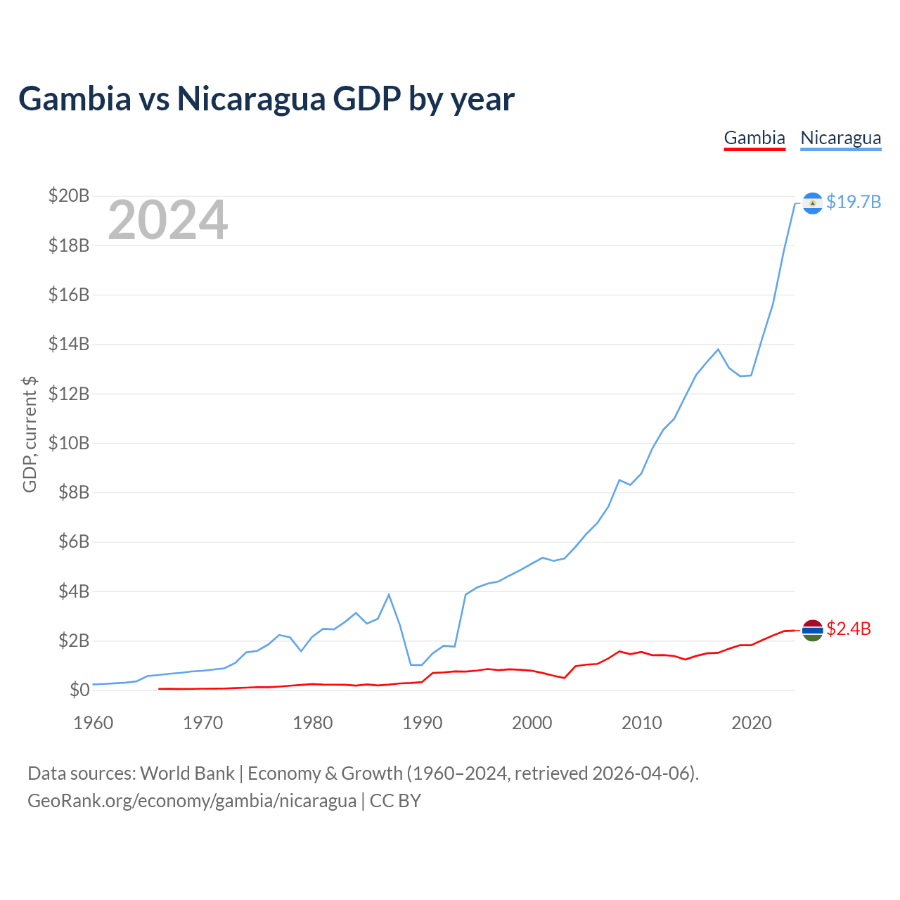 The Gambia has a GDP of $2.4B compared to $19.7B for Nicaragua, ranking 174/197 and 131/197 by economy size, respectively.