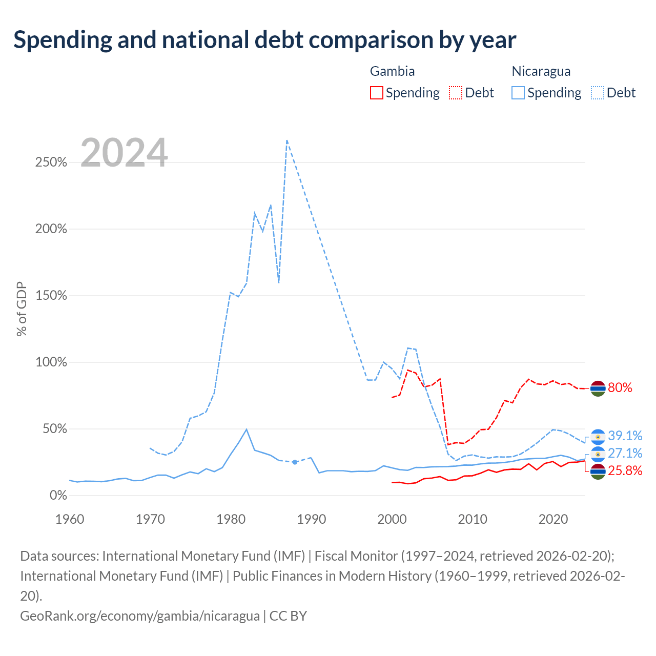 The Gambia has $1.92B in government debt (80% of GDP), compared to $7.71B (39.1% of GDP) in Nicaragua.