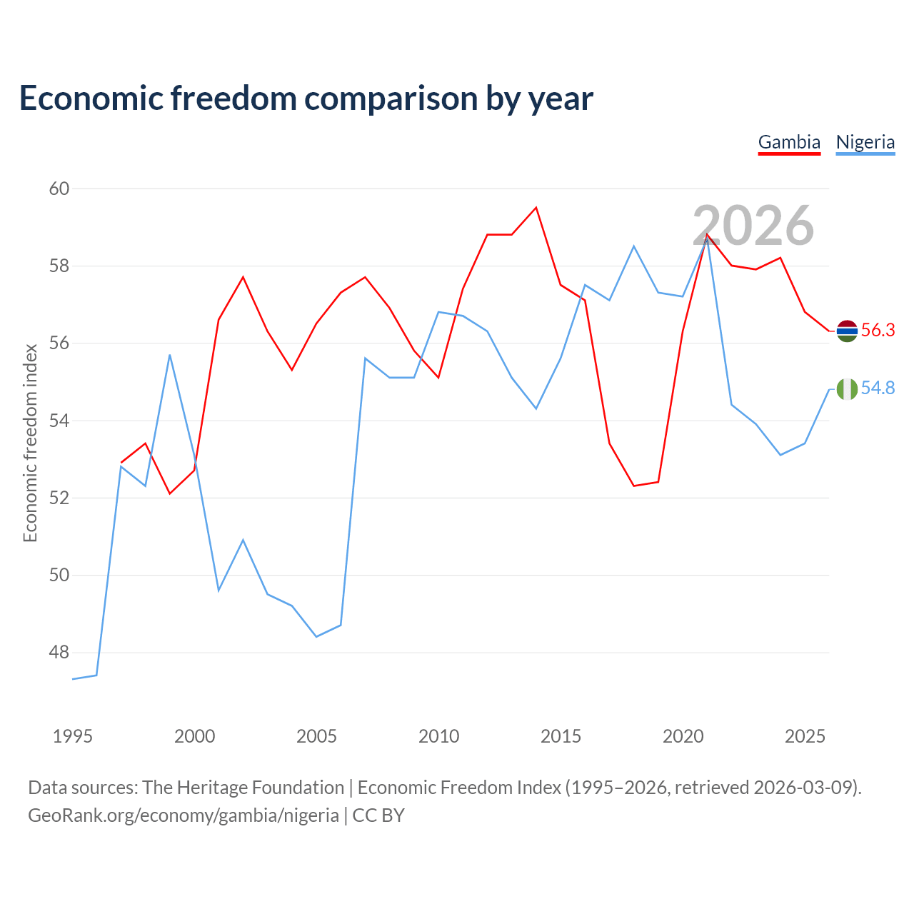 The Economic Freedom Index for the Gambia is 56.3, ranking 123/197, compared to 54.8 for Nigeria, ranking 132/197. The chart above displays a comparison of annual changes in economic freedom indexes.