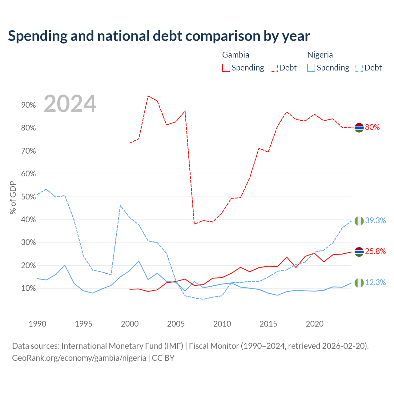 The Gambia has $1.92B in government debt (80% of GDP), compared to $99.2B (39.3% of GDP) in Nigeria.