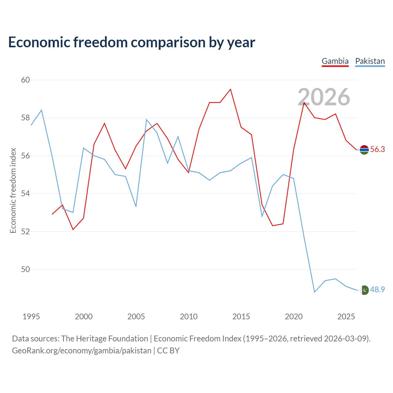 The Economic Freedom Index for the Gambia is 56.3, ranking 123/197, compared to 48.9 for Pakistan, ranking 168/197. The chart above displays a comparison of annual changes in economic freedom indexes.