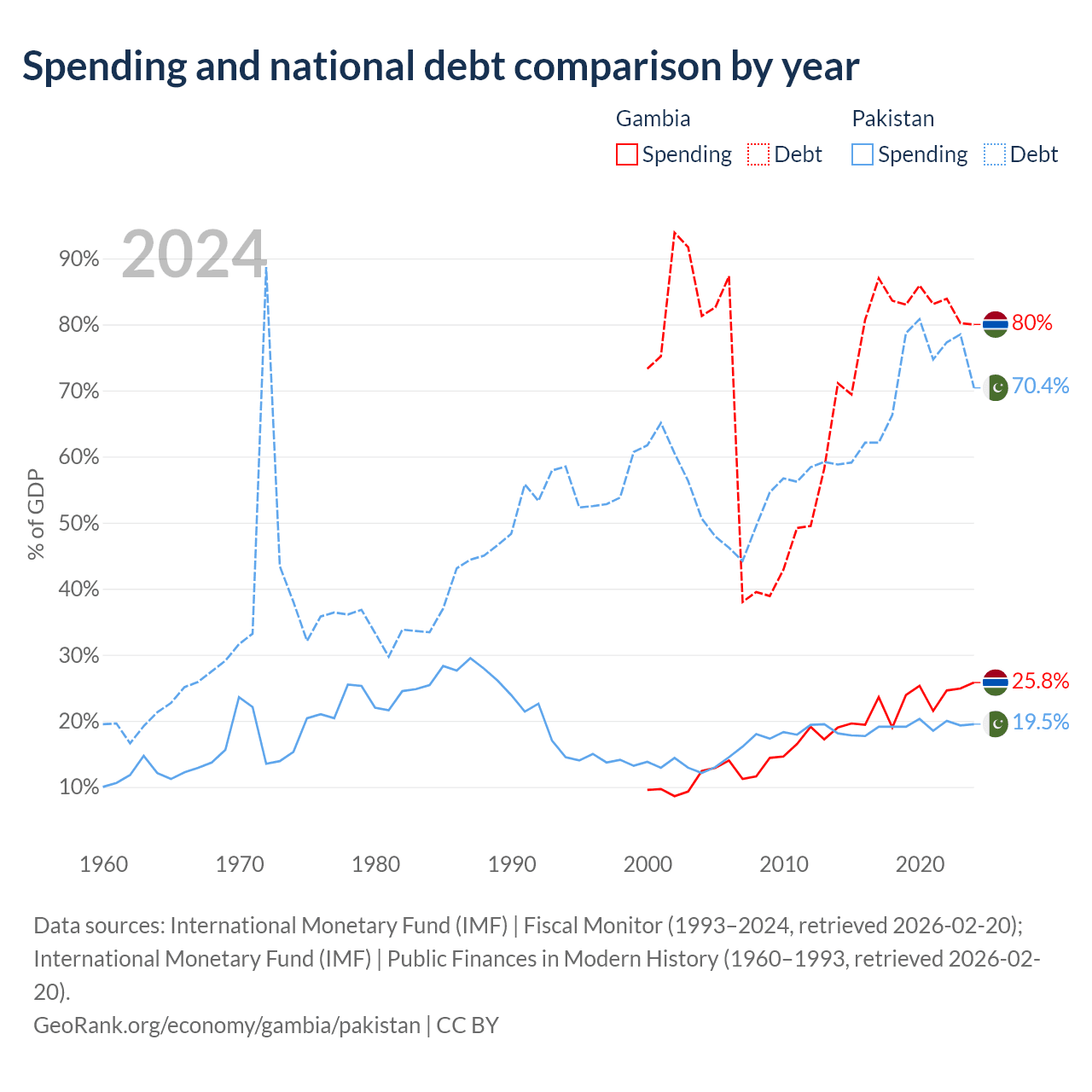 The Gambia has $1.92B in government debt (80% of GDP), compared to $262B (70.4% of GDP) in Pakistan.