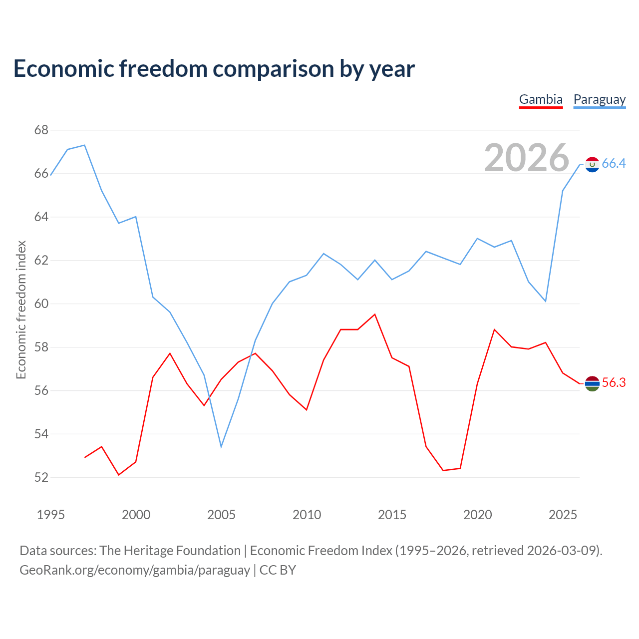 The Economic Freedom Index for the Gambia is 56.3, ranking 123/197, compared to 66.4 for Paraguay, ranking 61/197. The chart above displays a comparison of annual changes in economic freedom indexes.
