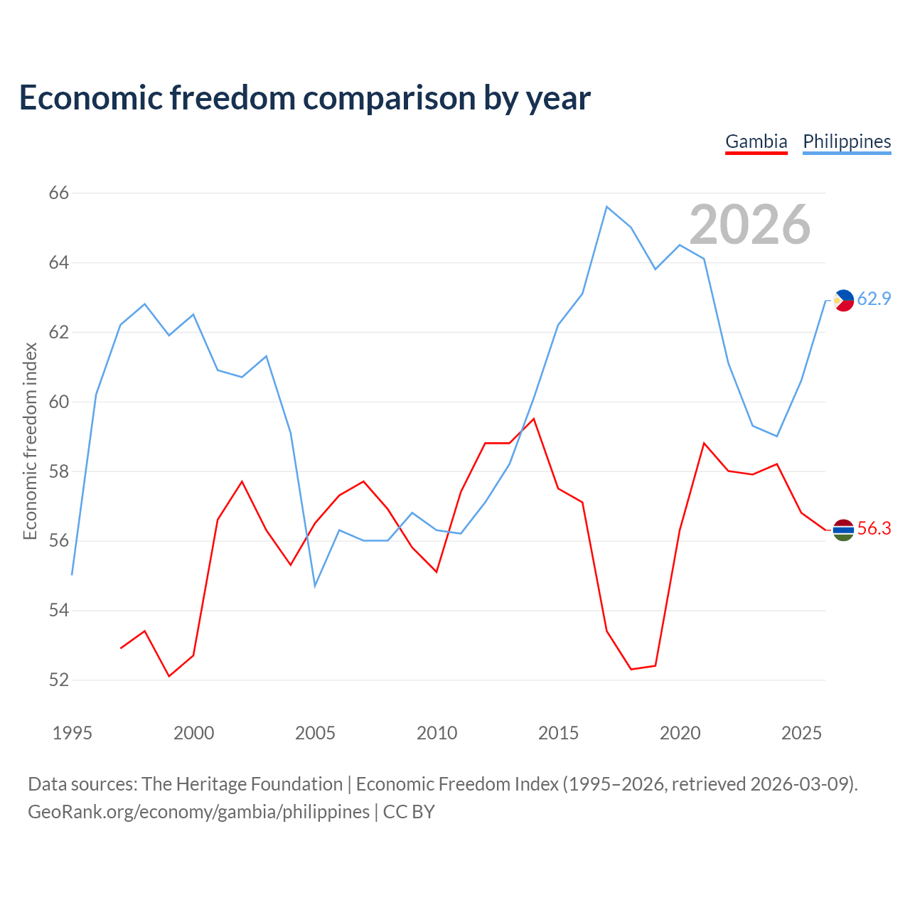The Economic Freedom Index for the Gambia is 56.3, ranking 123/197, compared to 62.9 for the Philippines, ranking 85/197. The chart above displays a comparison of annual changes in economic freedom indexes.