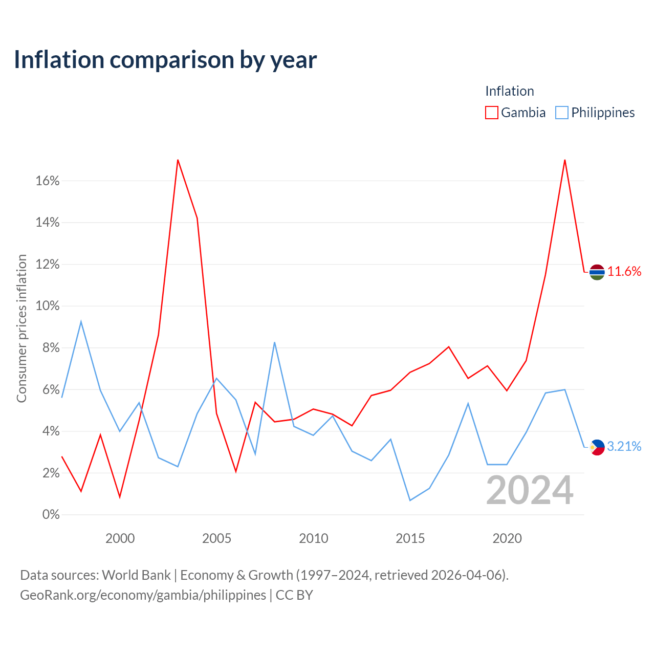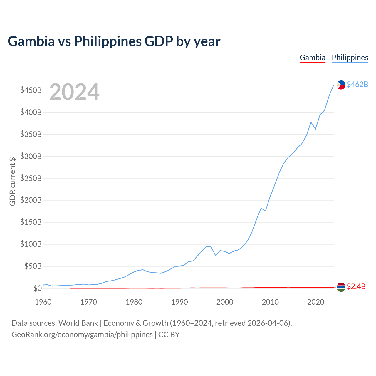 The Gambia has a GDP of $2.4B compared to $462B for the Philippines, ranking 174/197 and 35/197 by economy size, respectively.