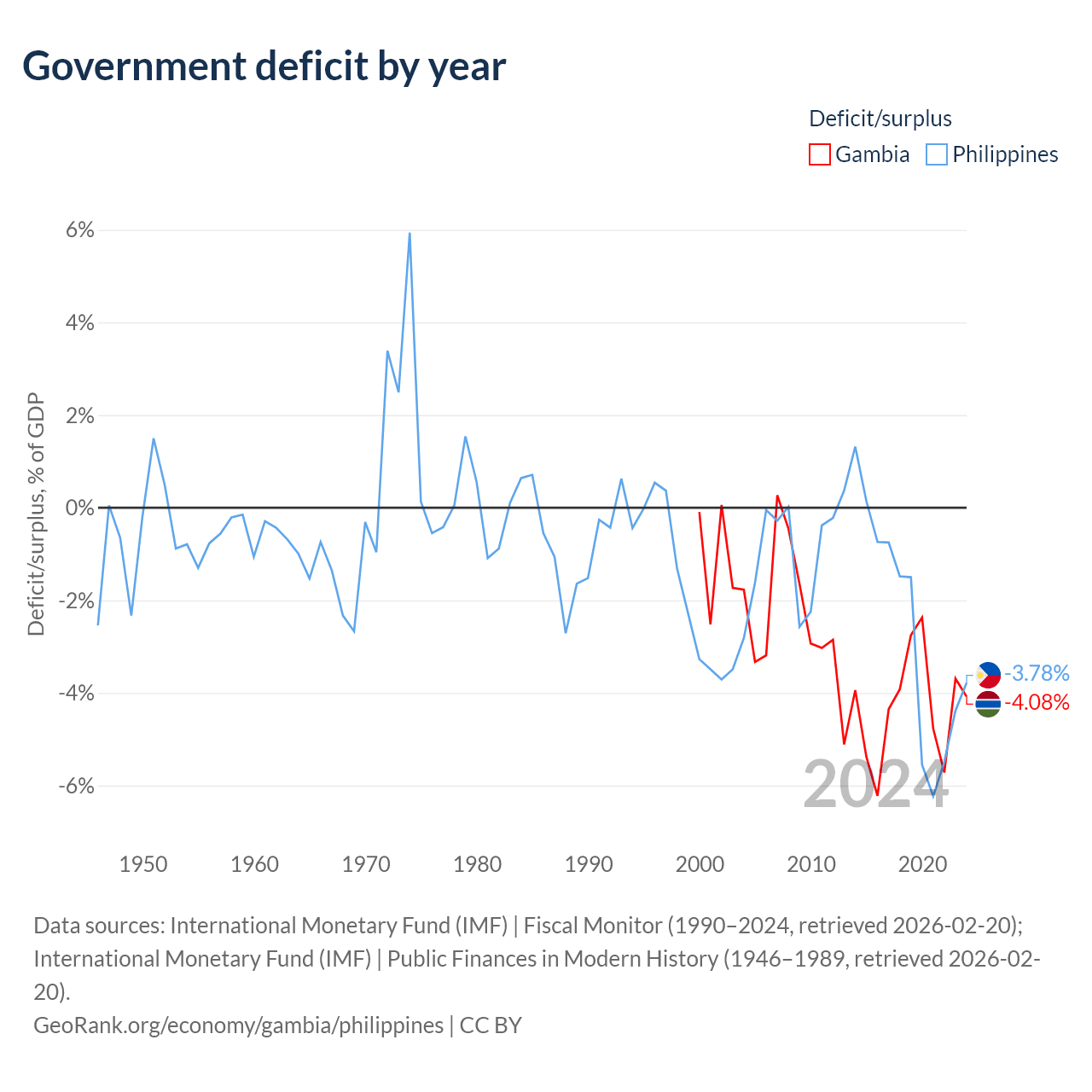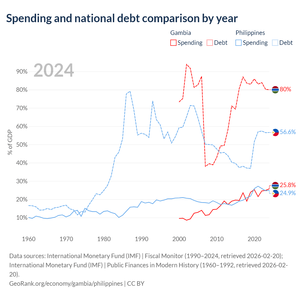The Gambia has $1.92B in government debt (80% of GDP), compared to $261B (56.6% of GDP) in the Philippines.